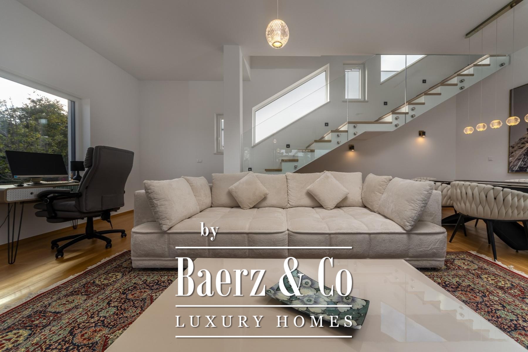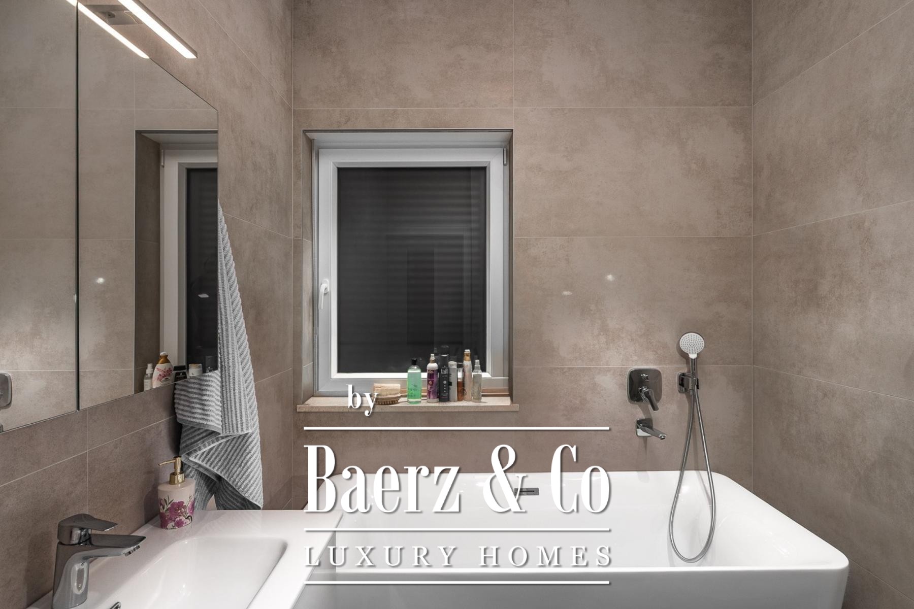 De indeling van de villa is elegant verdeeld over twee verdiepingen. De begane grond omvat een royale woonkamer met grote glazen wanden die overvloedig daglicht binnenlaten en toegang geven tot een overdekt terras. Hiernaast ligt een indrukwekkend zwembad van 3 bij 23 meter, omlijst door de weelderige mediterrane tuin. Een moderne keuken met eethoek, technische ruimte en verfijnd gastentoilet maken deze verdieping compleet, met een open haard die uitnodigt tot sfeervolle avonden.