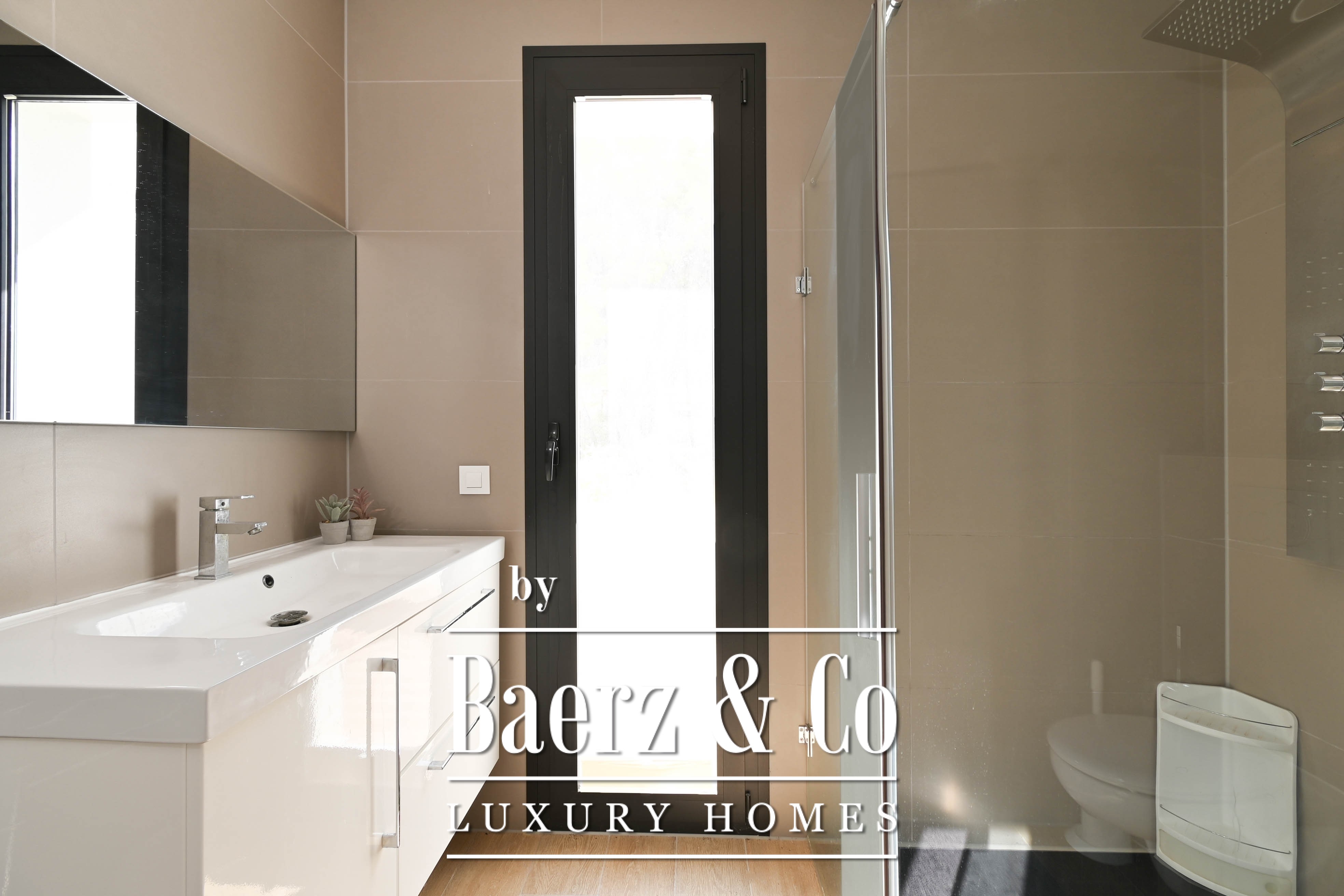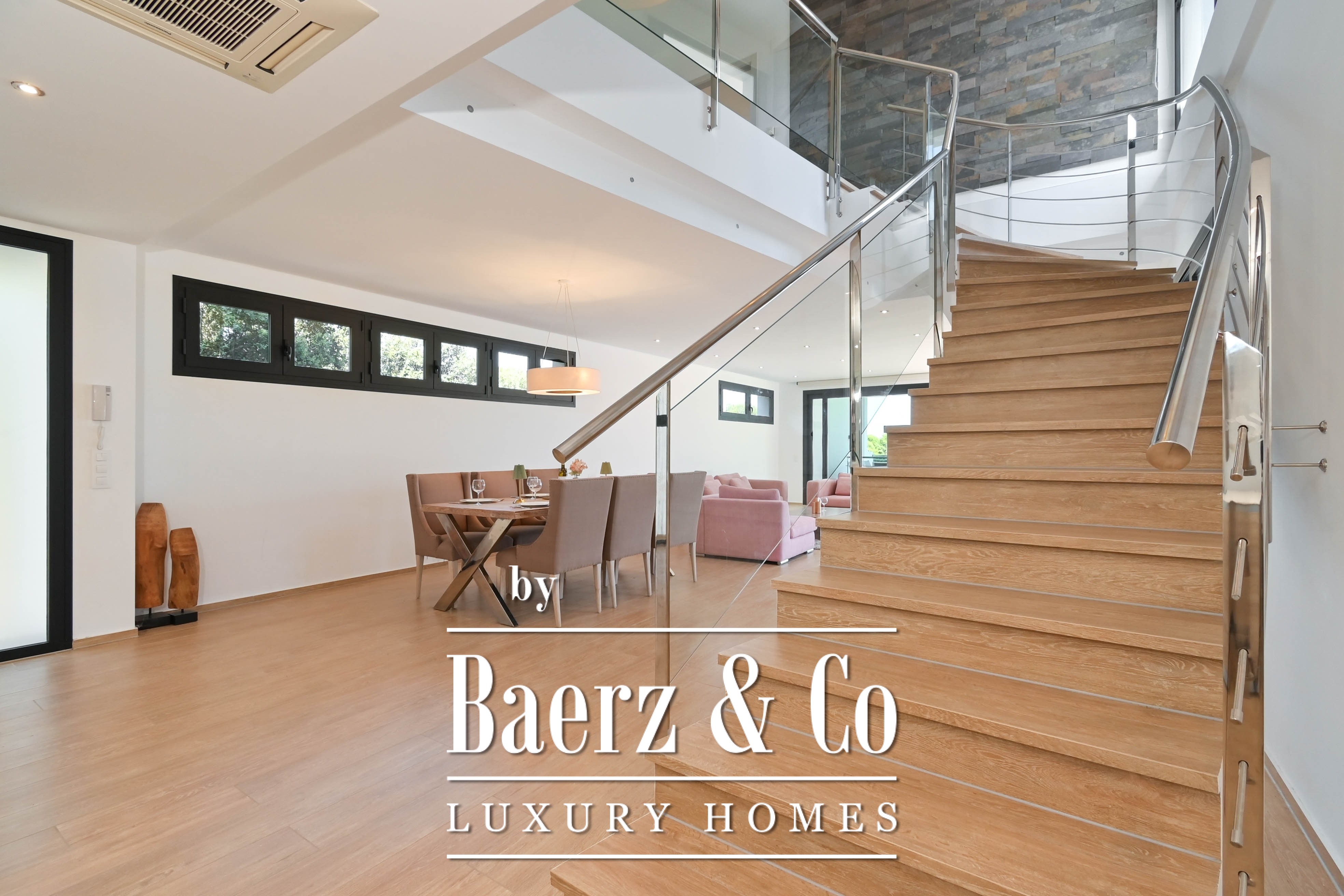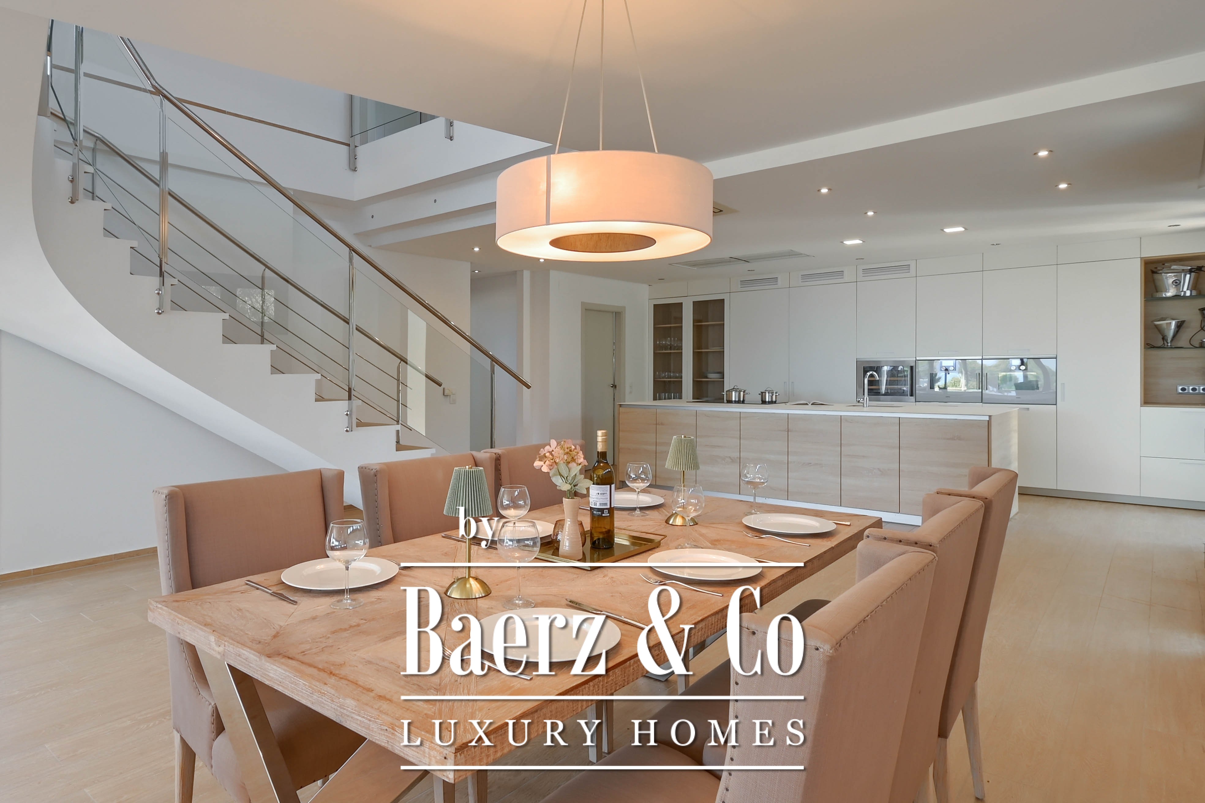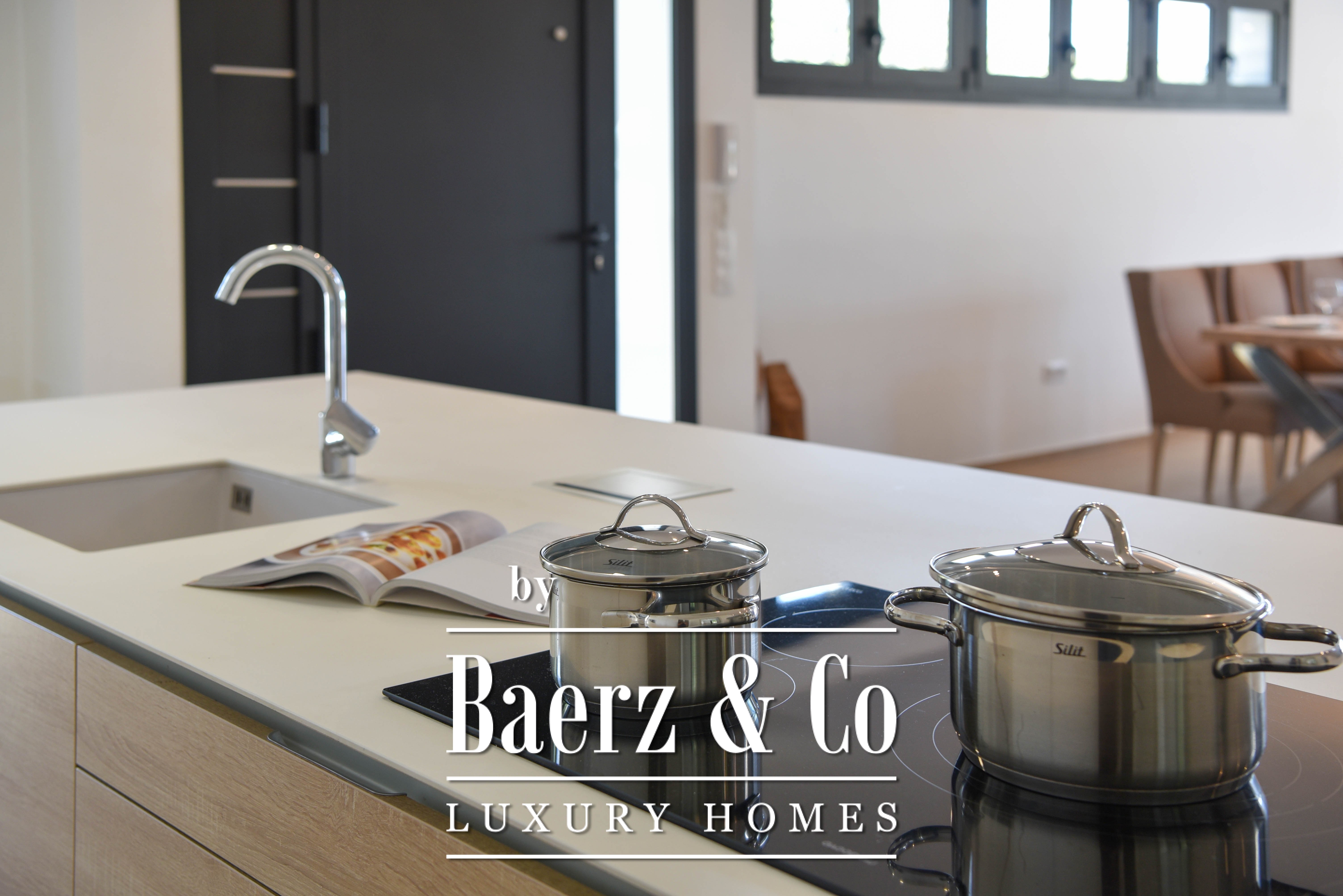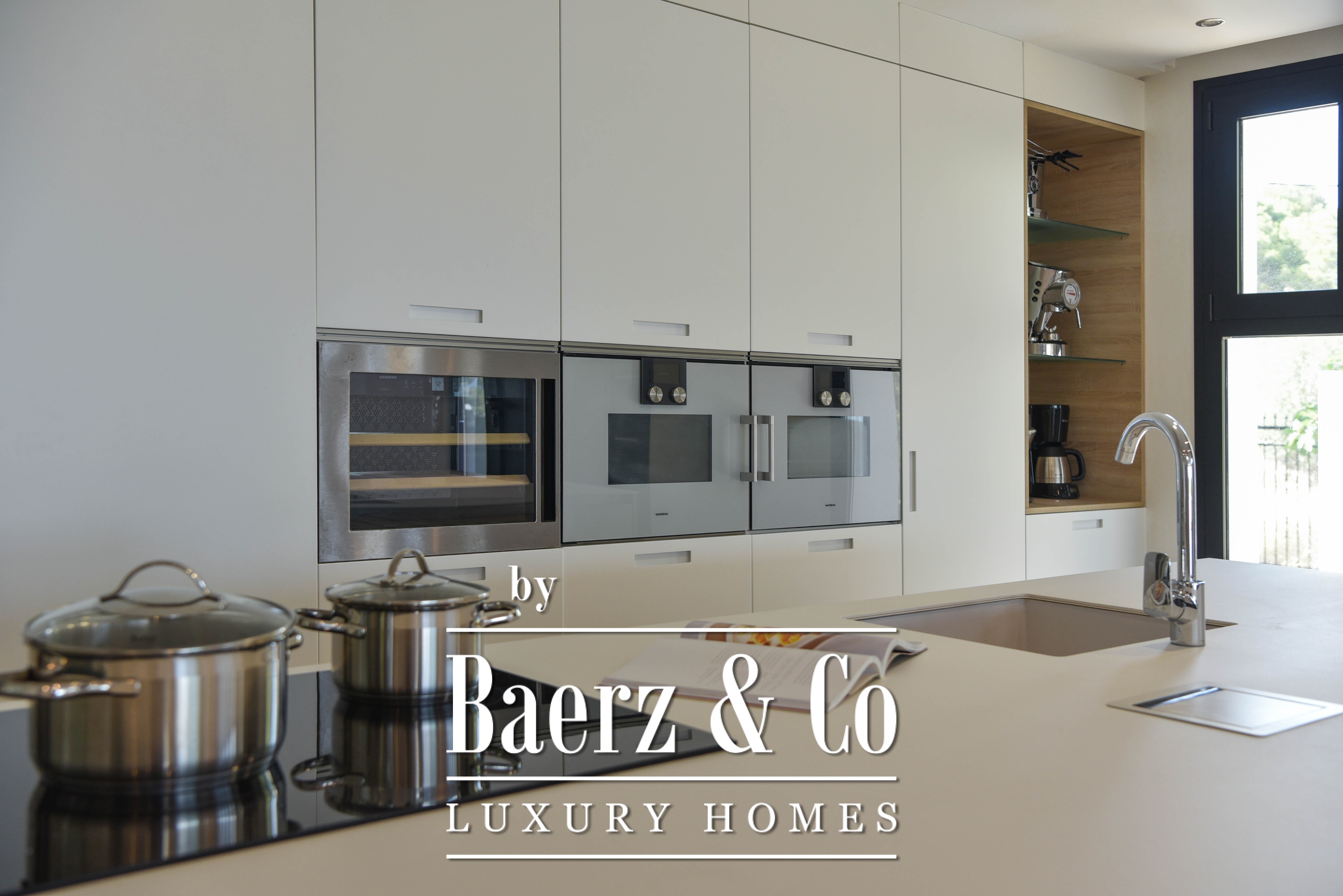 De villa beschikt over een open keuken die naadloos overgaat in de lichtrijke leefruimte. Grote raampartijen zorgen voor een natuurlijke verbinding tussen binnen en buiten, en laten het mediterrane licht royaal binnenstromen.