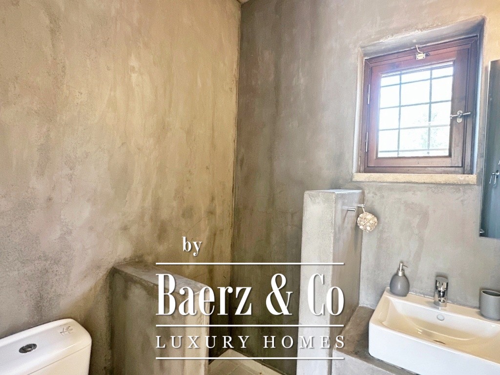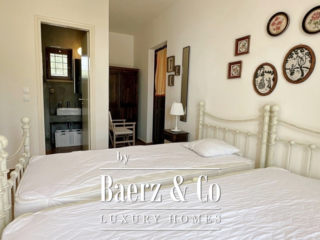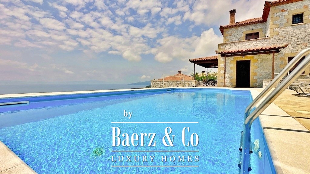 Via de stenen trap bereikt u de eerste verdieping, waar het uitzicht zich westwaarts opent naar de Ionische Zee en ononderbroken zonsondergangen biedt, zowel vanuit het interieur als het aangrenzende buitenterras. Buiten wordt de woning omlijst door een privézwembad, een met steen betegelde barbecuezone en royale bergruimte. Het landgoed ligt op een exclusief perceel van 484 m² binnen een totale kavel van 1.900 m², inclusief toegangsrechten en de karakteristieke stenen omheining. Een aangrenzend perceel van 1.826 m² biedt mogelijkheden voor een bouwuitbreiding van nog eens 200 m² in de toekomst. Dubbel glas, autonome elektrische verwarming en airconditioning garanderen comfort gedurende het hele jaar, terwijl het panoramische uitzicht op zee en bergen bijdraagt aan een ontspannen levensstijl.