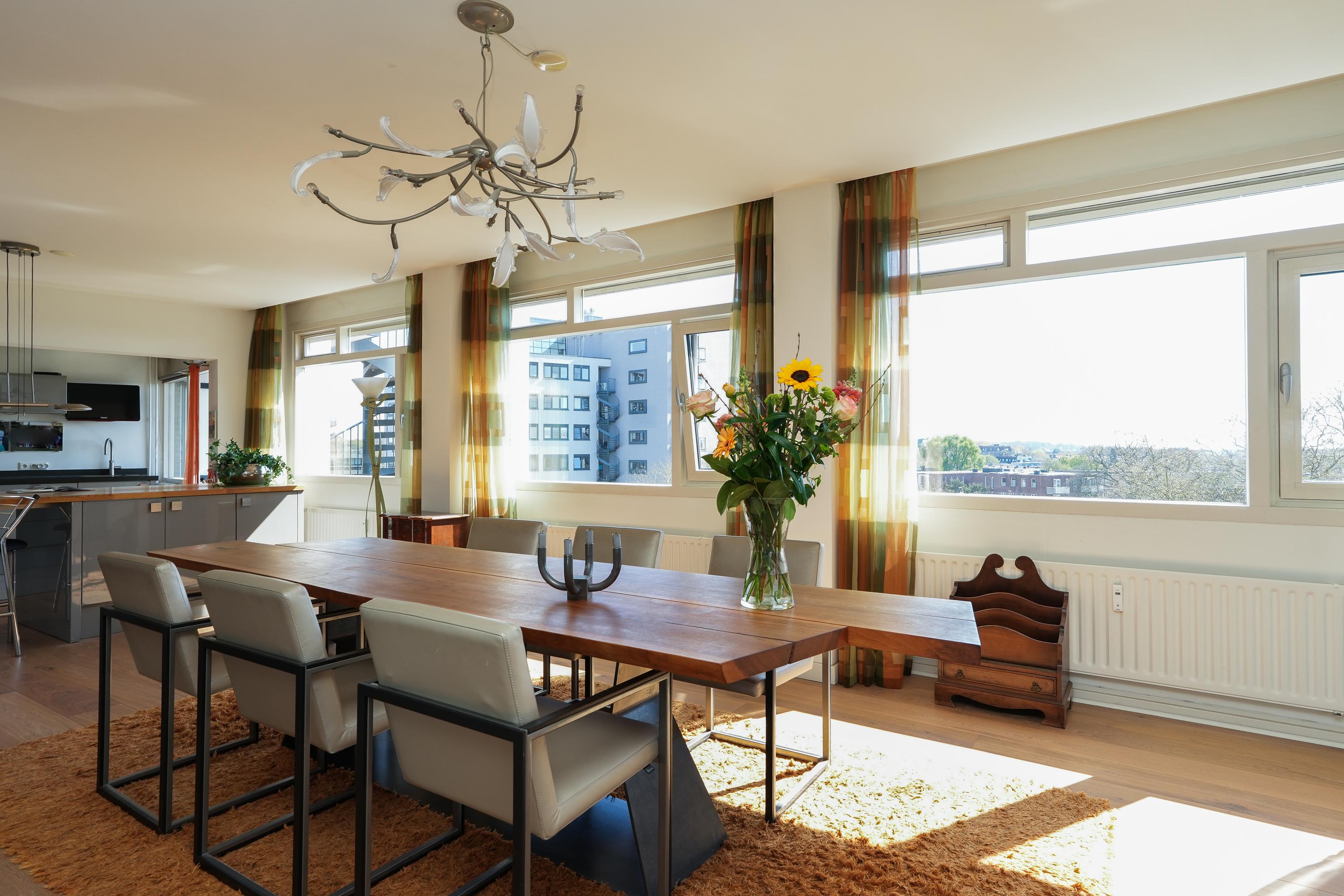 Entree appartement met een beveiligde toegangsdeur. Het appartement is zeer licht door rondom ramen. Het beschikt over een lange, brede hal die als centrale verbinding dient. Bij binnenkomst bevinden zich de garderobe, het gastentoilet, een wasruimte en de open keuken. De keuken en woonkamer zijn beide direct bereikbaar vanuit de hal, wat zorgt voor een loftachtige sfeer en mooie, logische doorloop. De keuken is voorzien van diverse inbouwapparatuur en biedt toegang tot het eerste balkon welke op het zuiden gericht is. Aangrenzend aan de keuken bevindt zich een inpandige bijkeuken met extra opberg- en werkruimte. Vanaf de woonkamer en het balkon is er een prachtig uitzicht over de stad Nijmegen en de Radboud Universiteit. Een gashaard zorgt voor een scheiding tussen de eetkamer en de televisiehoek aan de zuidwest kant. Het westelijk gelegen balkon biedt een fraai uitzicht richting de Waal en de iconische Waalbrug.