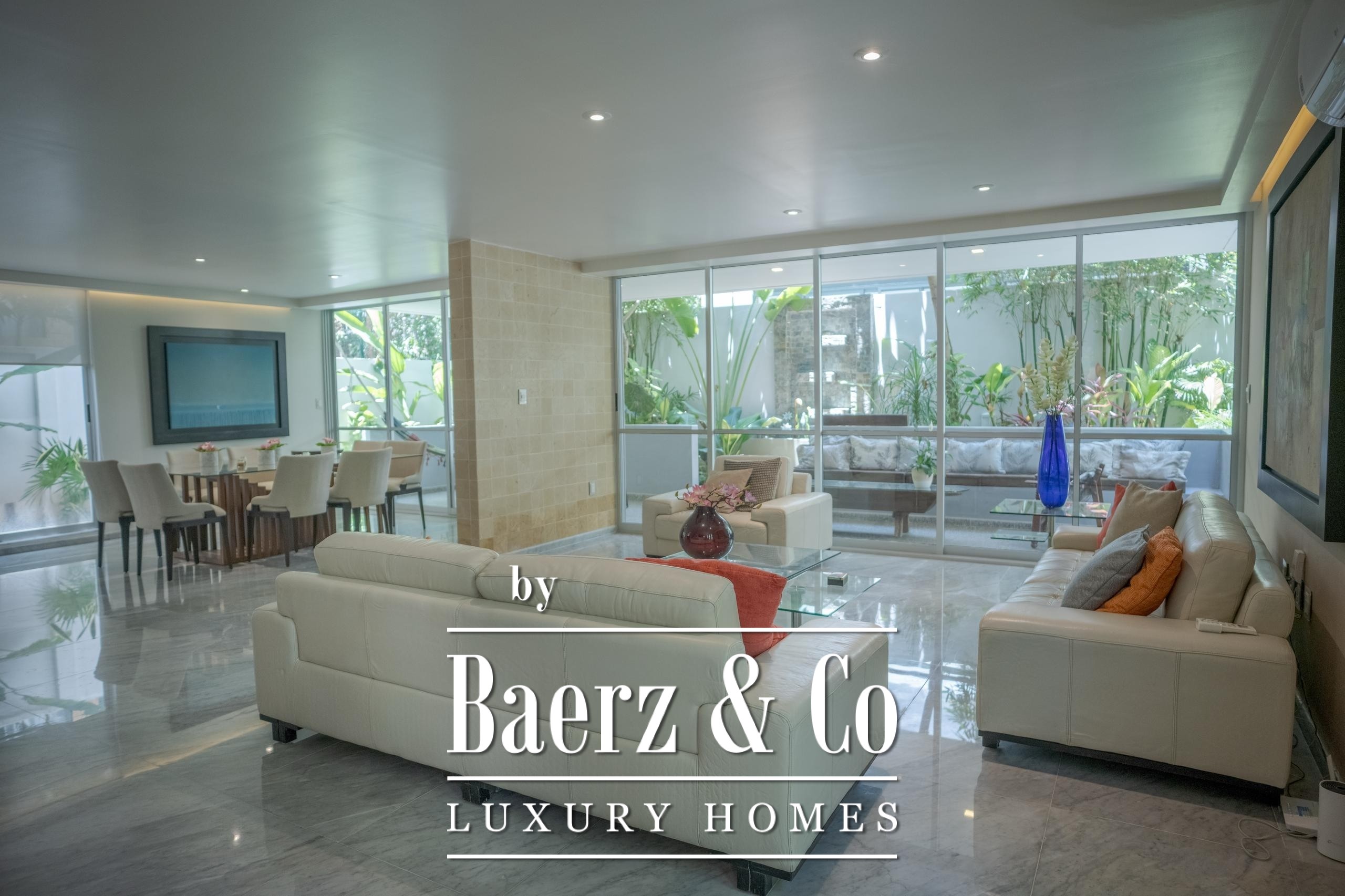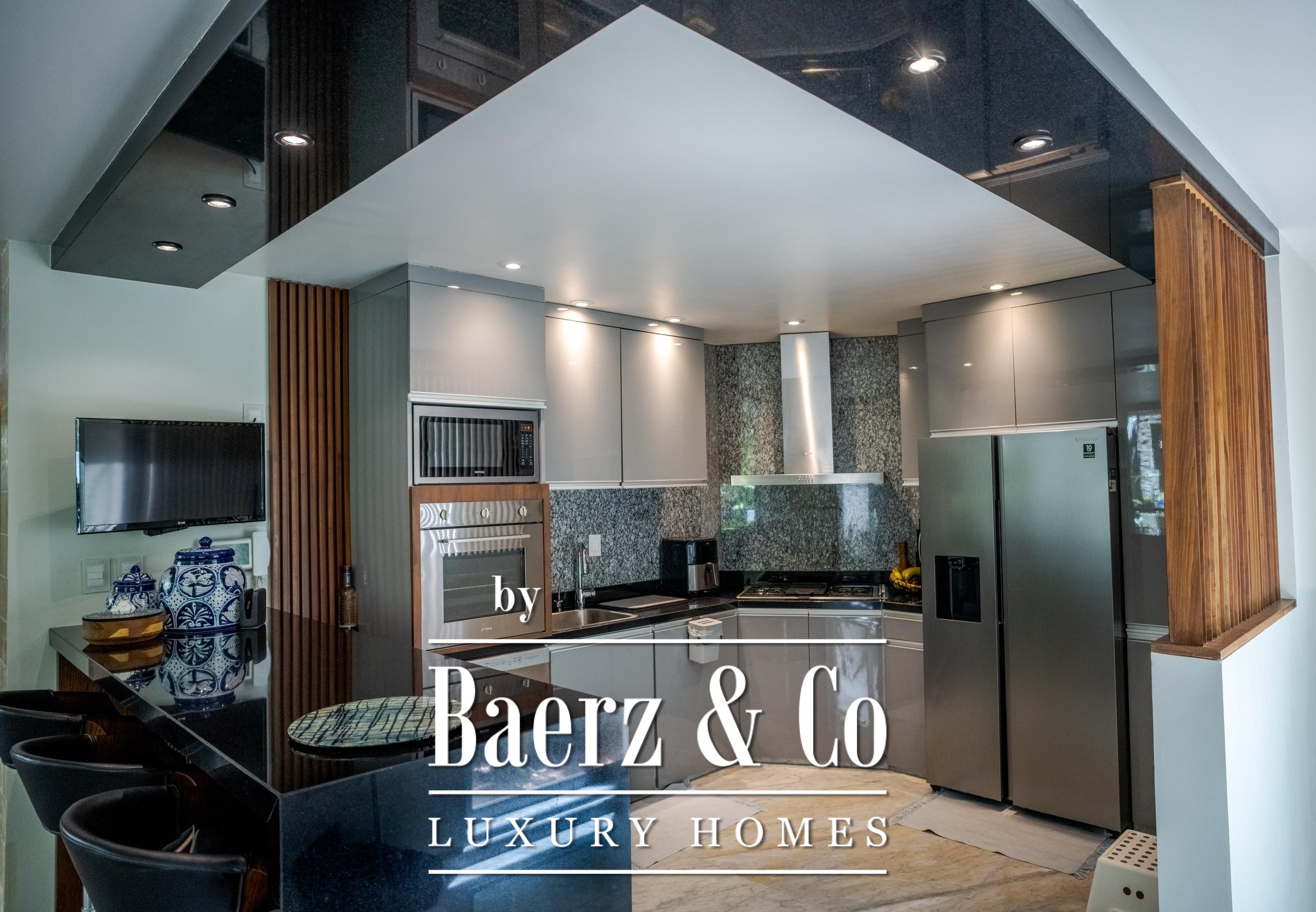 En planta baja, disfruta de una sala-comedor amplia con ventanales corredizos que se abren completamente hacia una terraza integrada con un hermoso jardín tropical, creando un ambiente ideal para el descanso o la convivencia. La cocina equipada cuenta con barra integrada al comedor, cubierta de granito negro y carpintería en madera, perfecta para quienes aman cocinar o recibir invitados.