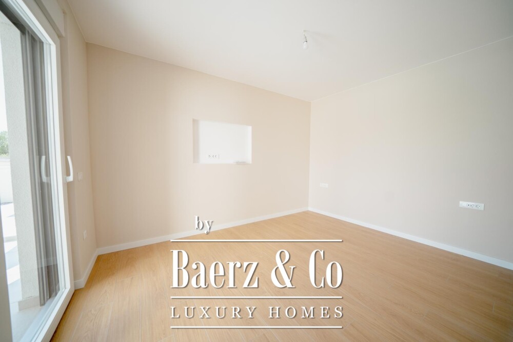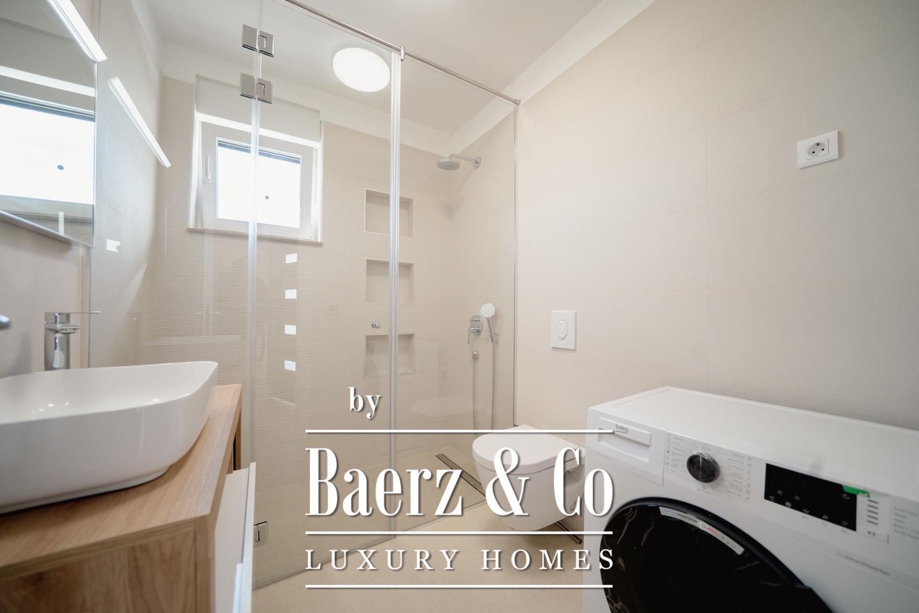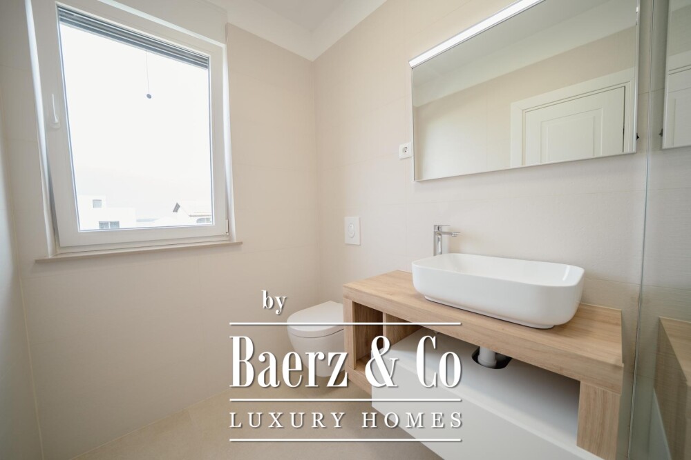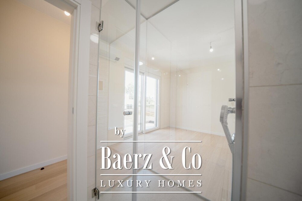 Op de eerste verdieping bevinden zich drie slaapkamers met elk een eigen badkamer; de master suite is voorzien van een aparte kleedkamer. Twee slaapkamers bieden toegang tot hun eigen terras met subtiel zeezicht en verbinding met de rustige omgeving. Vloerverwarming via een warmtepomp, airconditioning in iedere kamer, elektrische rolluiken en zorgvuldige isolatie zorgen voor comfort en efficiëntie, het hele jaar rond.