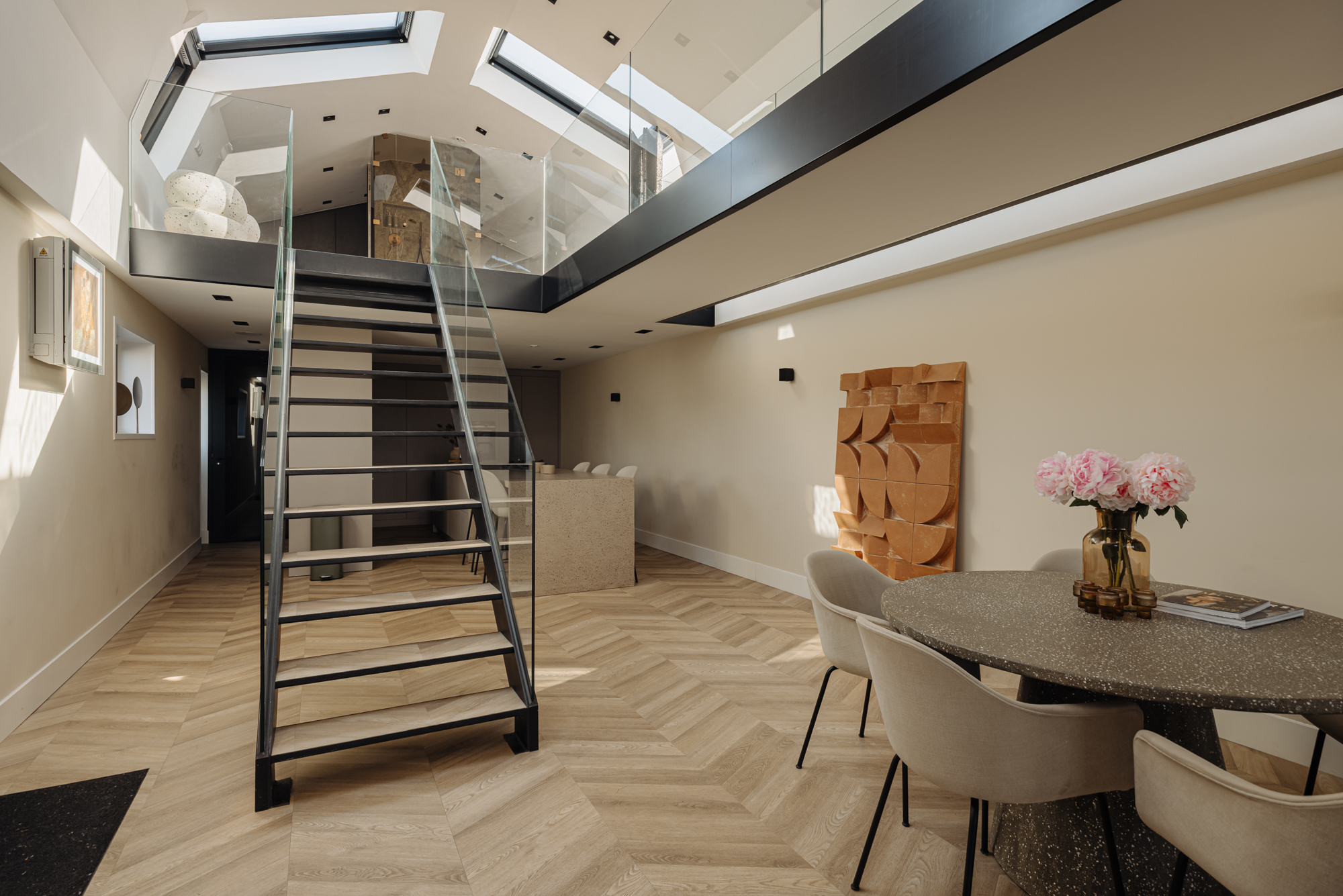 De living, gezellige woonkeuken met kookeiland / eetkamer en de zithoek met open haard, vormen de plattegrond van deze verdieping in het hoofdgebouw. De woonkeuken is gemaakt van rijke materialen en voorzien van Boretti pitt cooking, Gaggenau wijnklimaatkast en overige inbouwapparatuur.