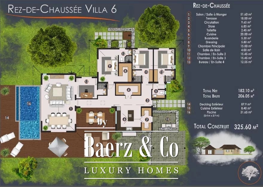 De gelijkvloerse woning beschikt over drie suites, elk met een eigen badkamer, en een ruime woonkamer die aansluit op een fraai aangelegd terras. Een volledig uitgeruste keuken met royale bergruimte, airconditioning en zorgvuldig gekozen details zorgen voor een bijzonder gevoel van comfort. Buiten nodigen een privézwembad, terras en weelderige tuin uit tot serene momenten onder de tropische hemel, met uitzicht tot aan de horizon.