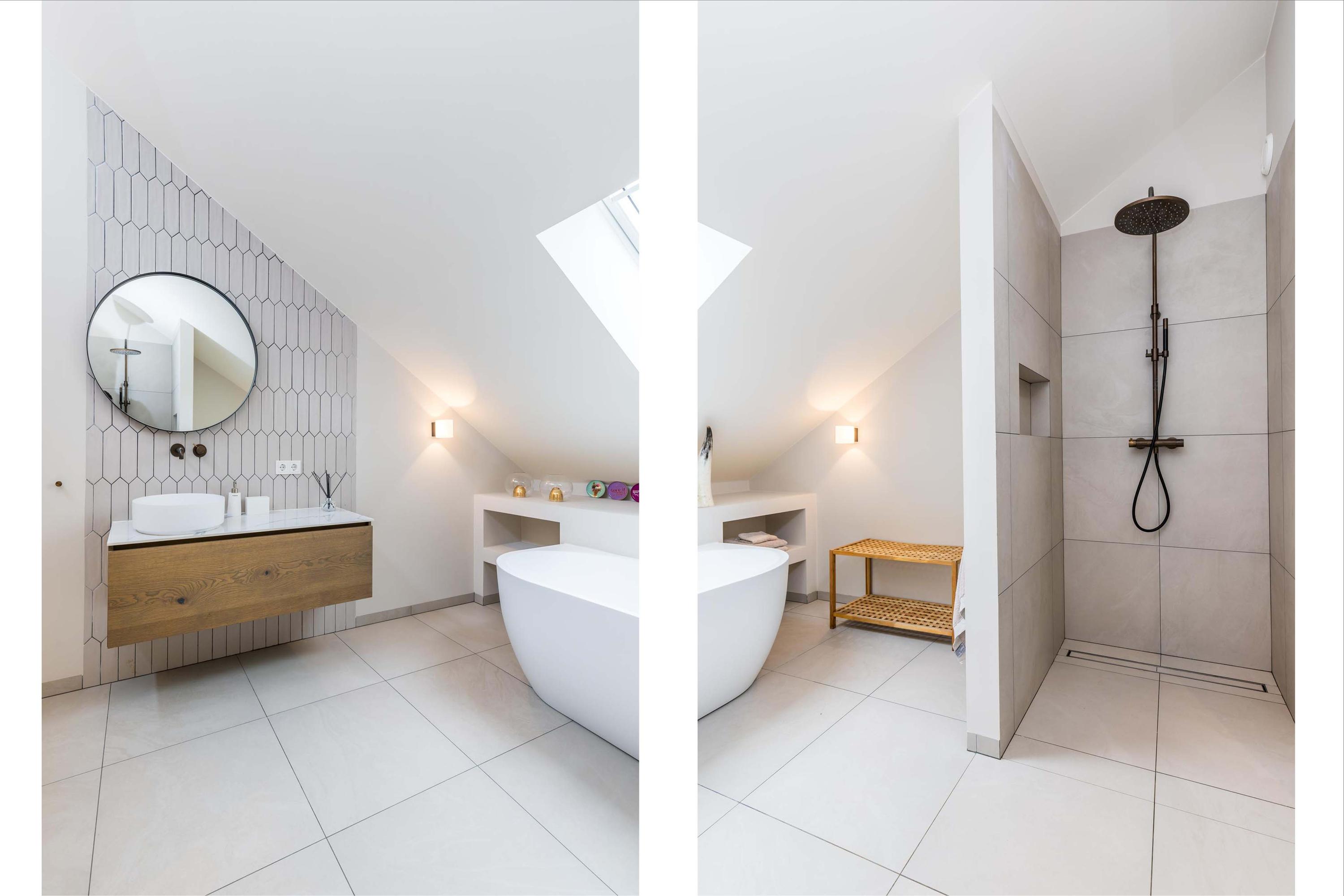 In het verlengde van de entreehal is er toegang tot de tuingerichte woonkeuken met een spectaculaire hoogte, een prachtige strakke keuken met kookeiland en voorzien van alle wenselijke inbouwapparatuur. Schuifpuien geven toegang tot het onderheide terras en de aantrekkelijke achtertuin.