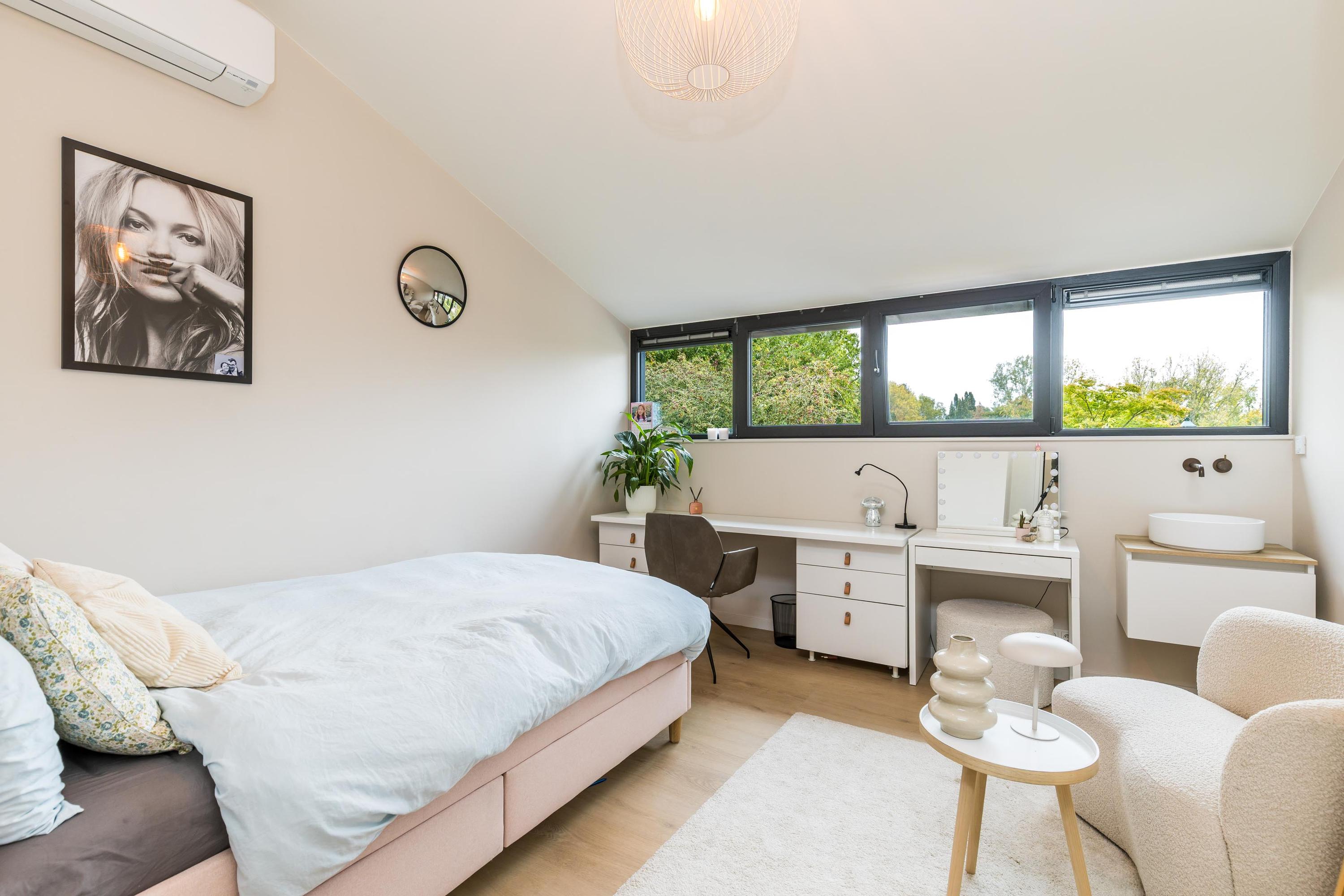 Charmante tuingerichte zitkamer met knusse open haard en leuke doorkijkjes naar zowel de voortuin als de achtertuin met beekje. Vanuit de woonkeuken is er toegang tot een ruimte tv-kamer aan de voorzijde. Eveneens vanuit de keuken is er een aparte gang met toilet voorzien van fonteintje en toegang tot de master bedroom met walk-in closet en eigen luxe badkamer met uitzicht op de tuin en voorzien van een vrijstaand ligbad, inloopdouche en wastafelmeubel. Voorts is er een ruime waskamer/mud room met veel bergruimte waar ook bijvoorbeeld een fitnesskamer van de maken is. In deze ruimte is de opstelling van de installaties, waaronder de warmtepomp, mooi weggewerkt.