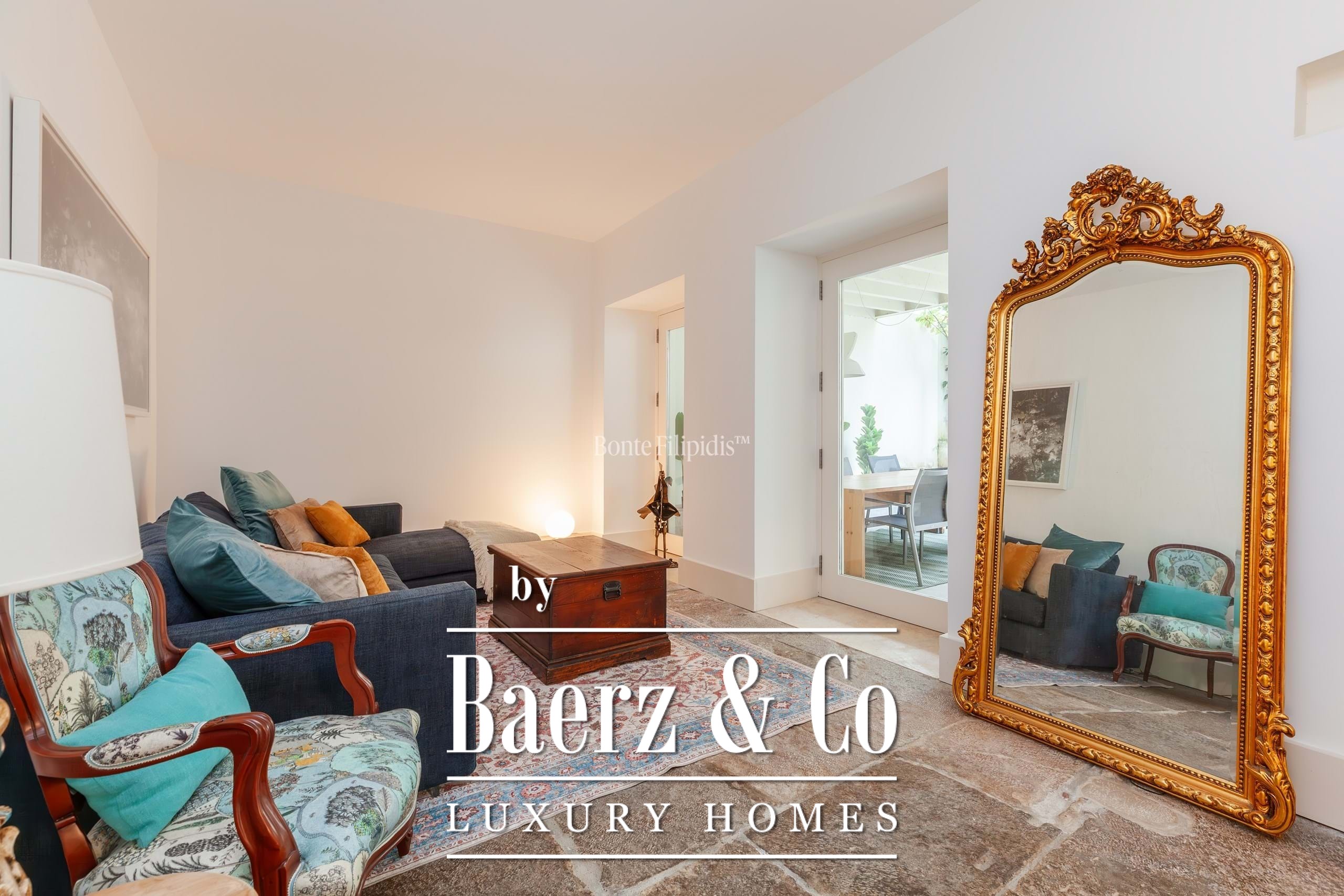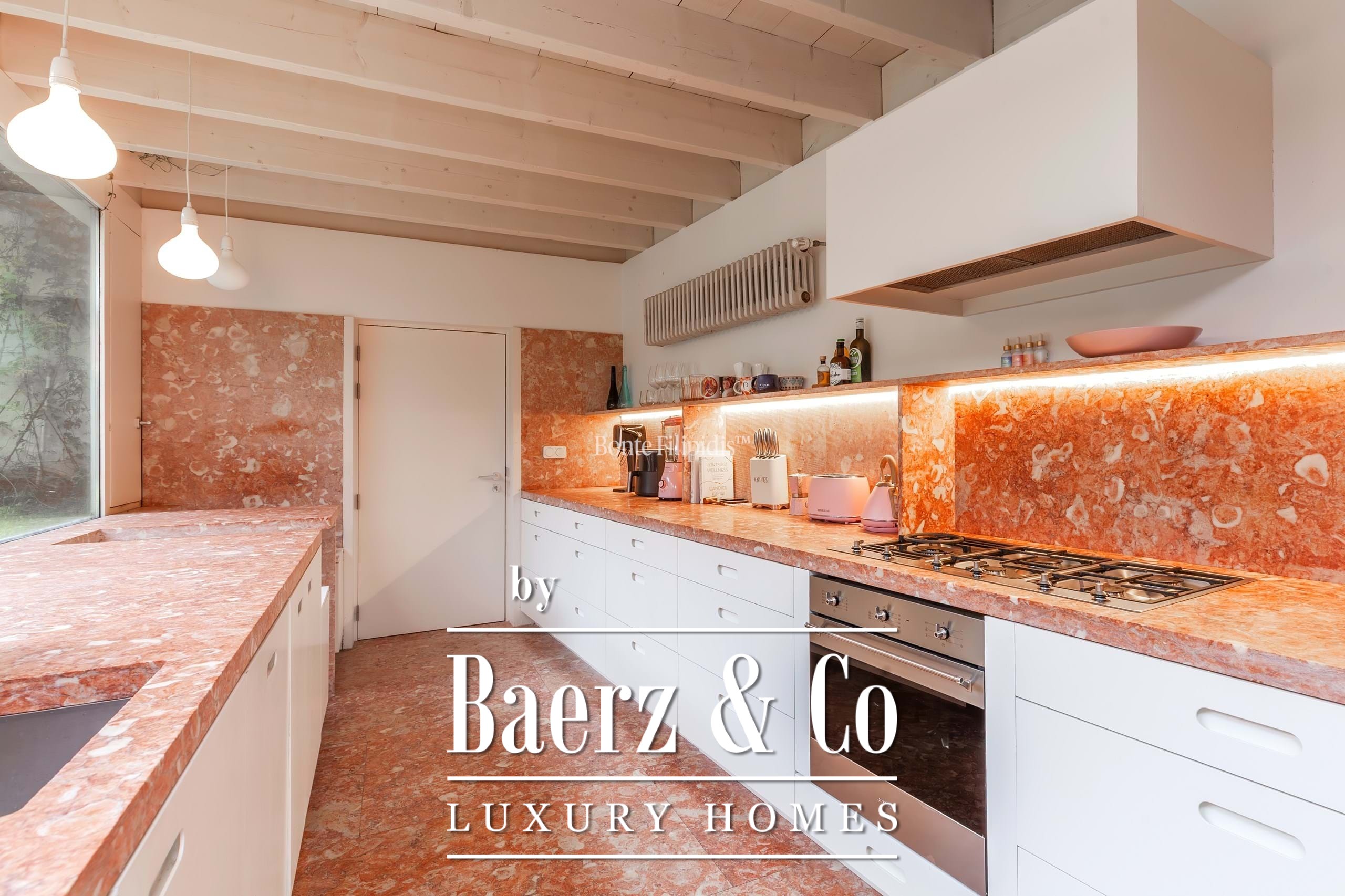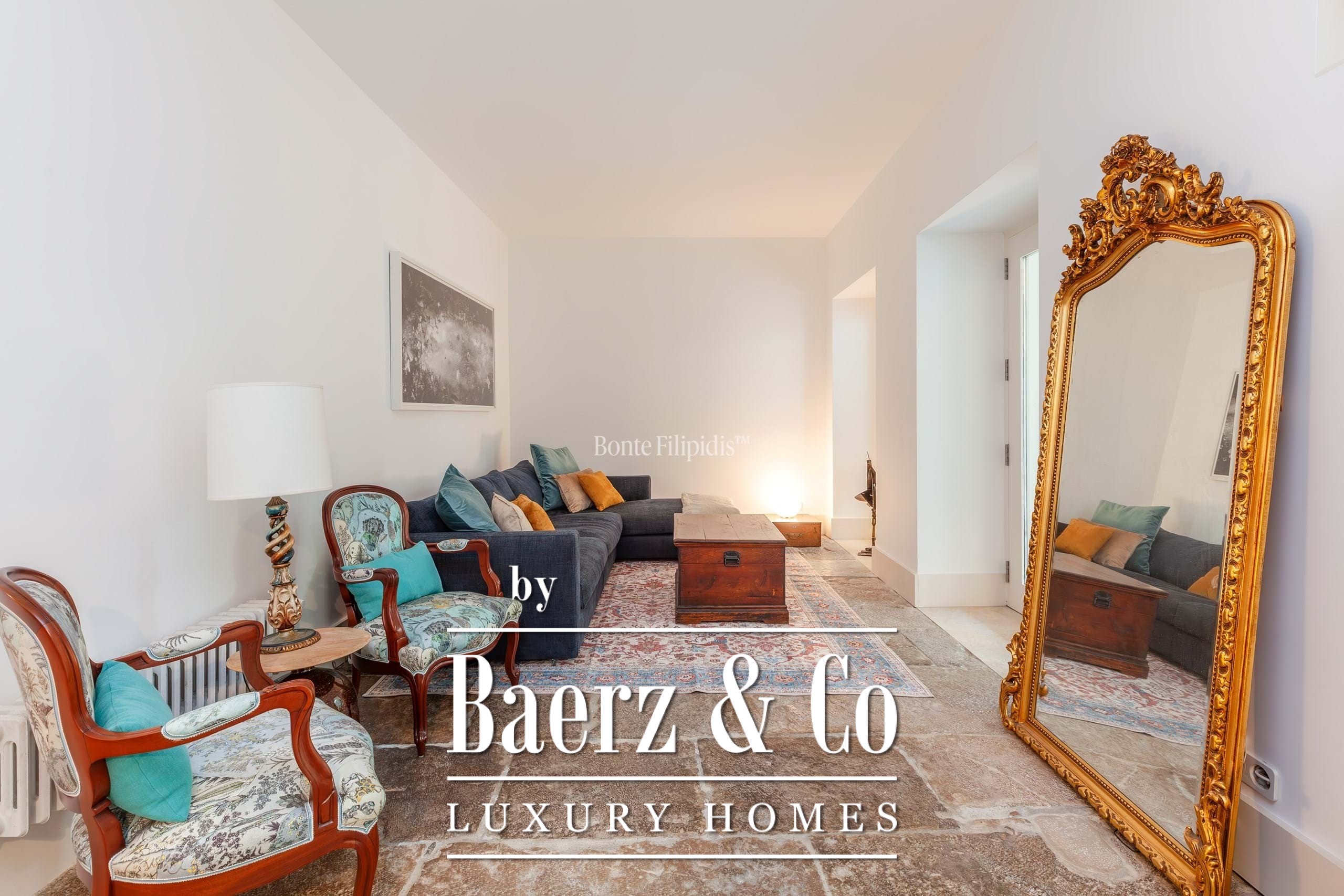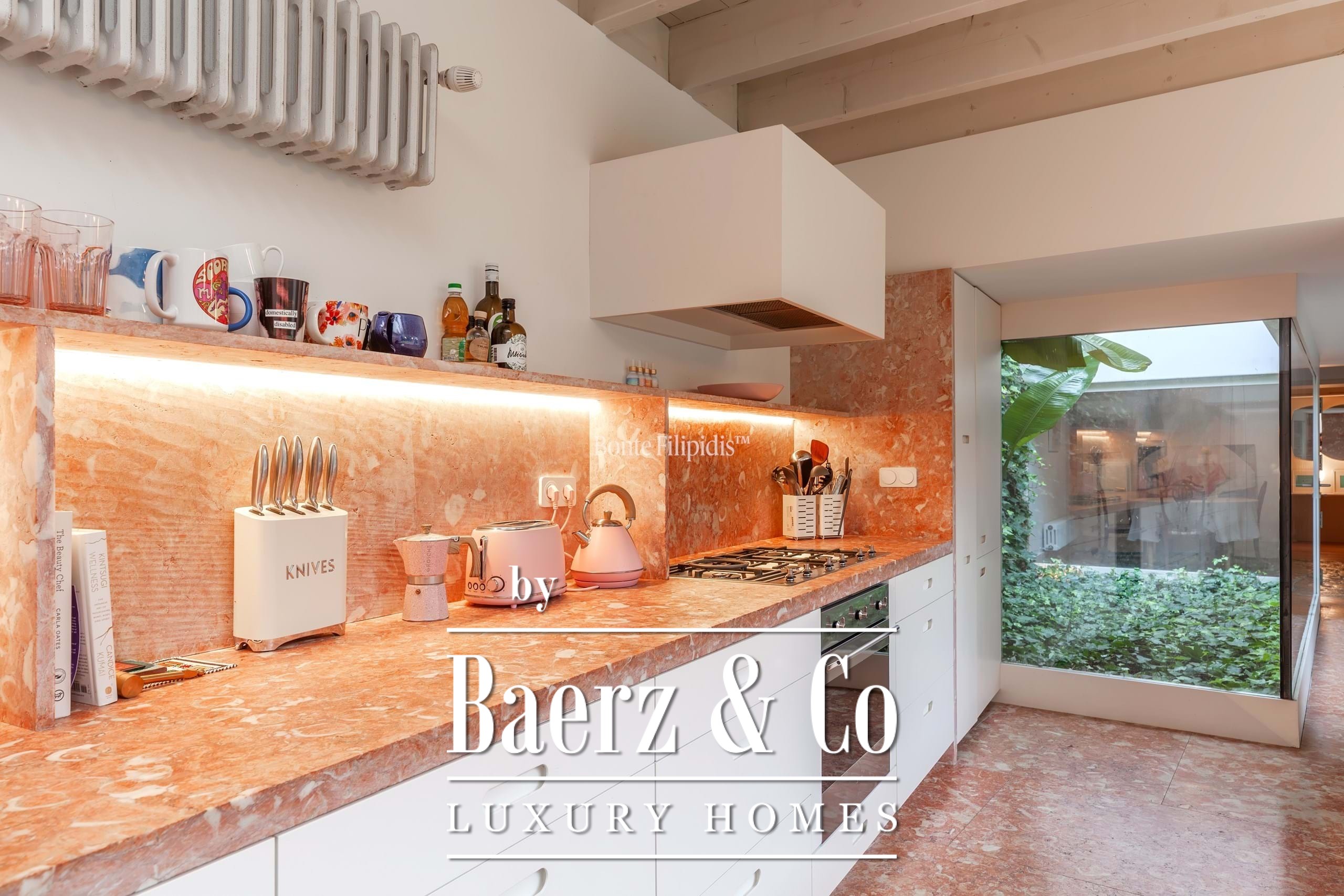 De belangrijkste leefruimtes worden gekenmerkt door originele stenen vloeren en subtiel vintage accenten, terwijl grote panoramische ramen overvloedig daglicht binnenlaten in het open woonconcept. De zit- en eetgedeeltes lopen vloeiend over in een privé tuin van 80 m², een rustige oase omringd door volwassen groen voor stille momenten of intieme bijeenkomsten. Geselecteerde materialen en verfijnde detaillering zorgen voor een ingetogen elegantie in elke ruimte.