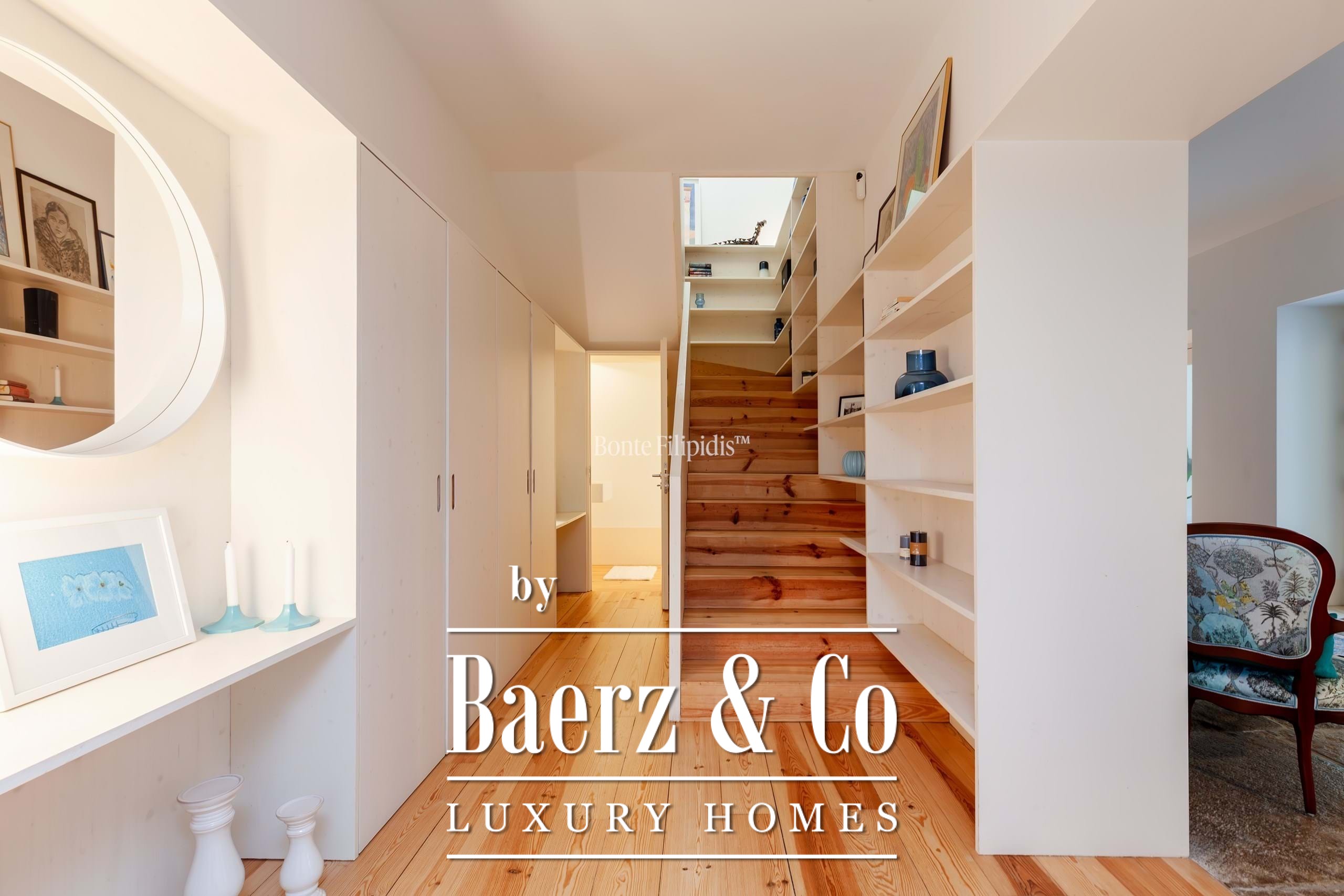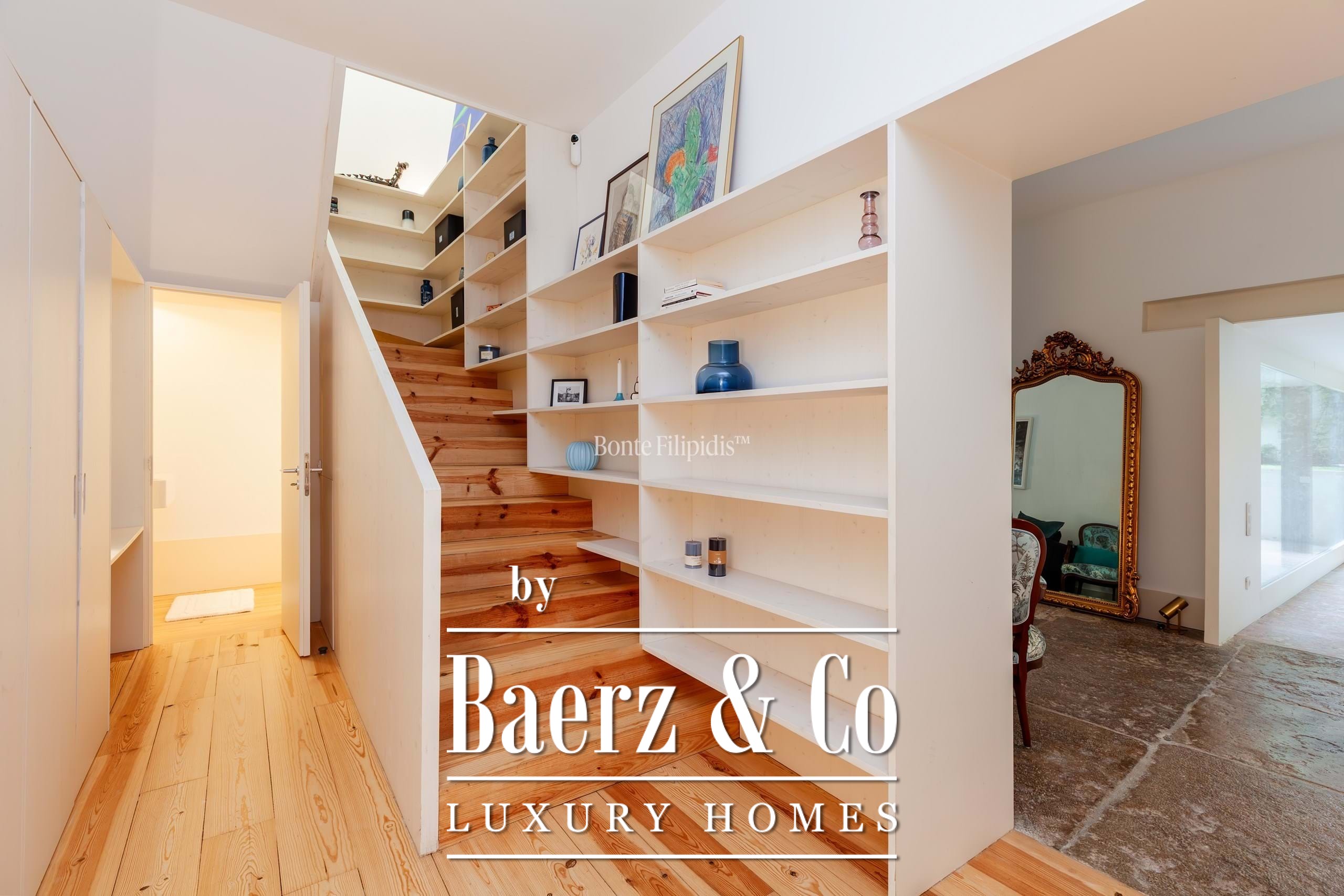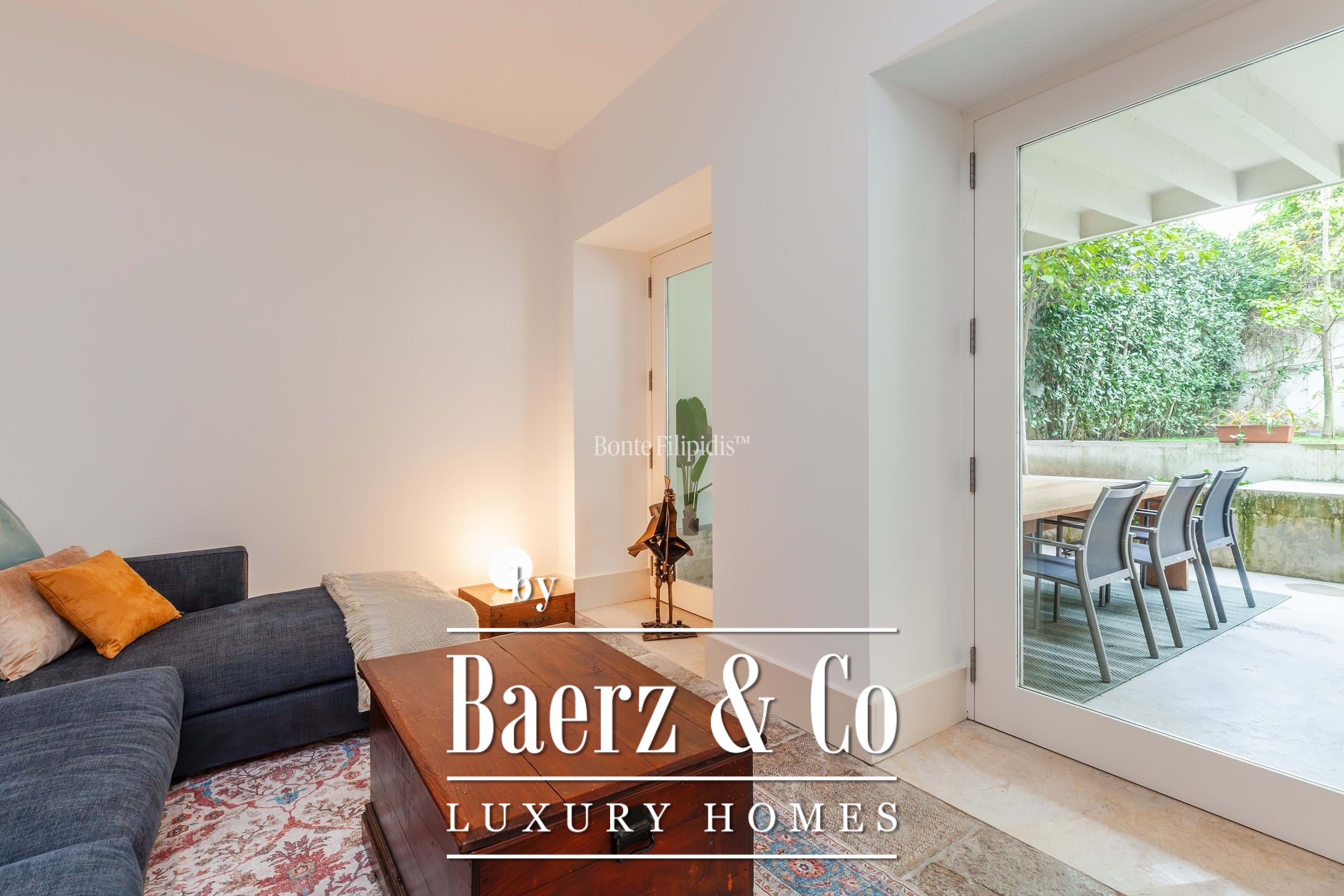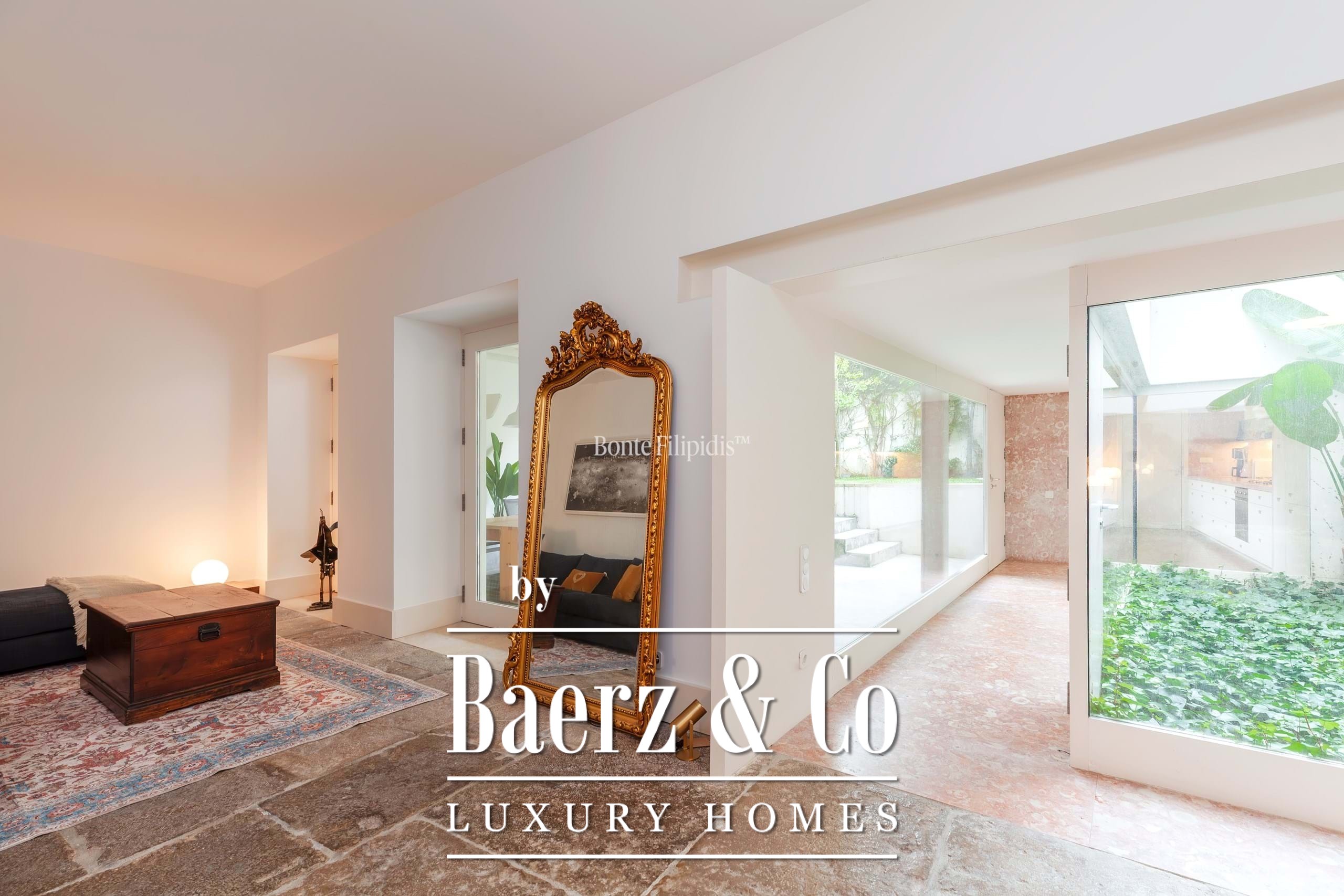 De belangrijkste leefruimtes worden gekenmerkt door originele stenen vloeren en subtiel vintage accenten, terwijl grote panoramische ramen overvloedig daglicht binnenlaten in het open woonconcept. De zit- en eetgedeeltes lopen vloeiend over in een privé tuin van 80 m², een rustige oase omringd door volwassen groen voor stille momenten of intieme bijeenkomsten. Geselecteerde materialen en verfijnde detaillering zorgen voor een ingetogen elegantie in elke ruimte.