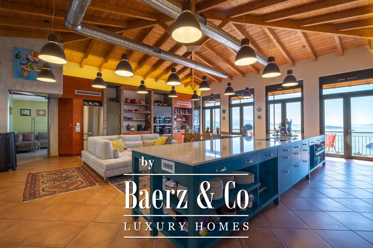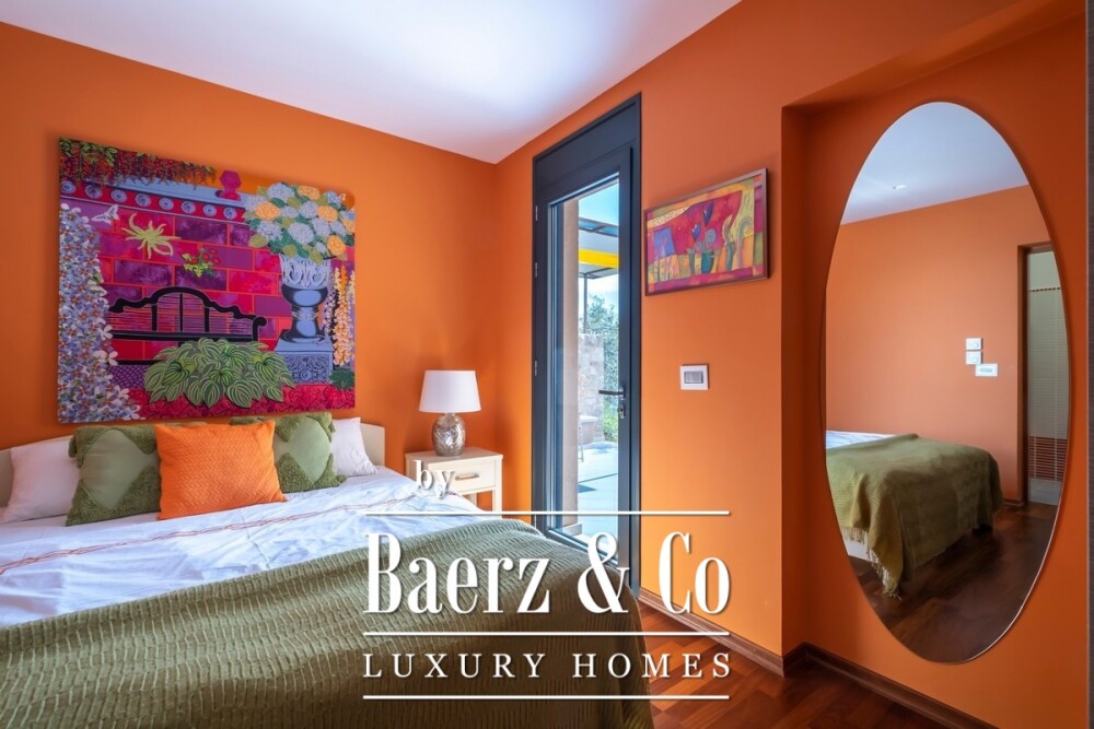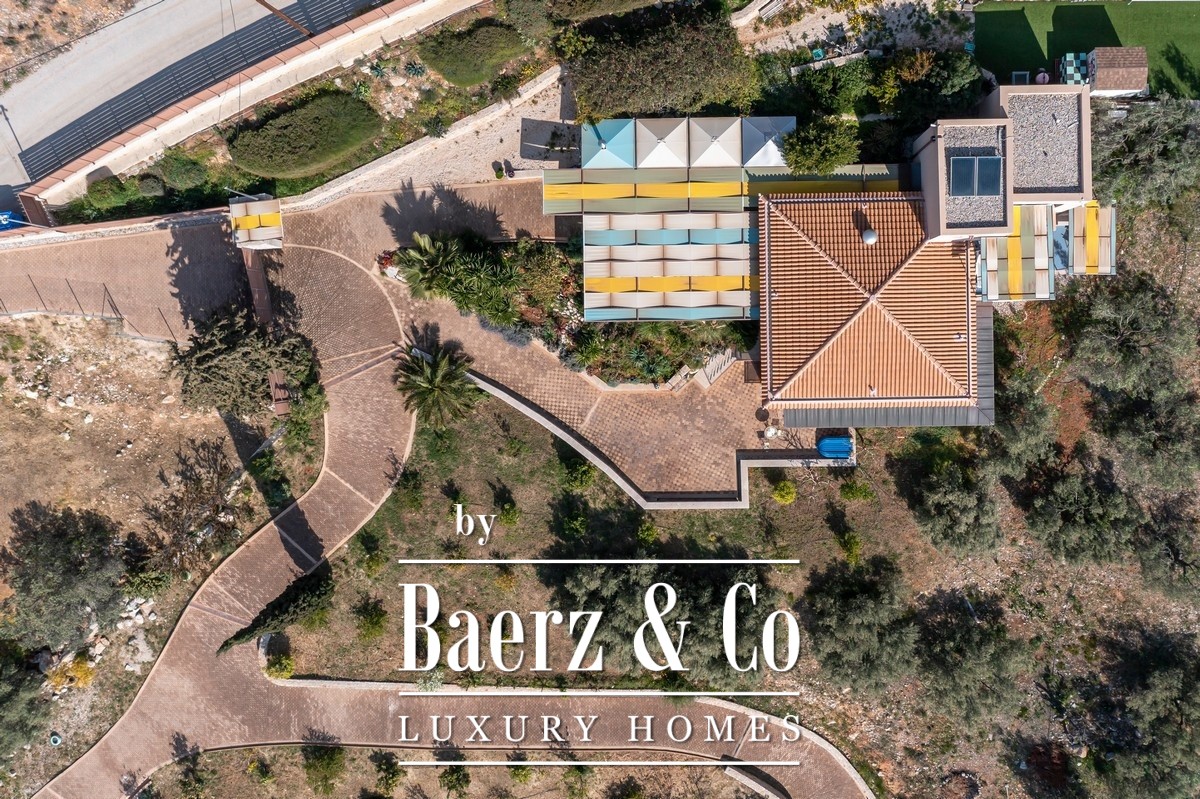 Vrijstaande villa Tolo ligt op een verhoogde positie boven de kustlijn en biedt zeezicht, omgeven door 4.000 m² grond, grotendeels aangelegd rondom volwassen olijf- en fruitbomen. Deze in 2016 voltooide woning beslaat 330 m² en onderscheidt zich door vier slaapkamers met eigen badkamer, waarvan drie uitkomen op een privéterras, en een doordachte indeling van de gemeenschappelijke ruimtes voor elegant wonen en gastvrijheid. Het belangrijkste buitenterras van 100 m² vormt een directe verlenging van het interieur en biedt een zorgvuldig gevormde setting voor dineren en ontspannen in de open lucht. Voorzieningen zoals een BBQ, girogrill en pizzaoven creëren een gastvrije, ongedwongen sfeer voor zowel grote als intieme gezelschappen.