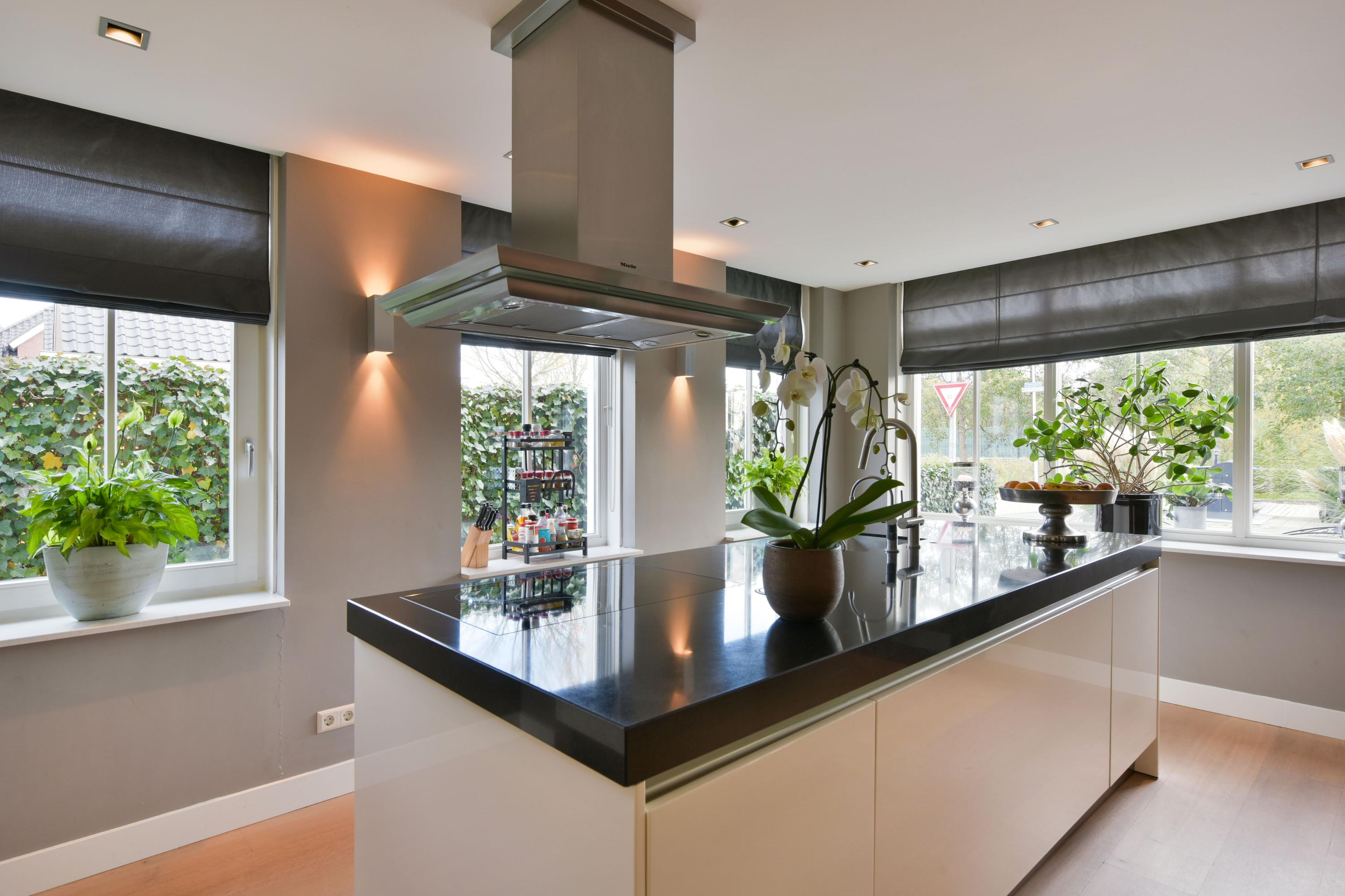 Stap de ruimtelijke woonkamer binnen en u wordt getroffen door het lichte karakter. De vele ramen laten het licht als het ware naar binnen stromen en zorgen voor een natuurlijke verbinding tussen binnen en buiten. Aan de voorzijde bevindt zich de eetkamer met een charmant erkerraam, een perfecte plek om het ochtendlicht te vangen bij het ontbijt of om gezellige diners te organiseren. Het midden van de woning wordt gekenmerkt door de open keuken, waar een groot kookeiland en kastruimte aan beide zijden alles bieden wat een thuiskok zich kan wensen. De keuken is voorzien van een inductiekookplaat, afzuigkap, vaatwasser en Quooker. De hoge kastenwand huisvest een koelkast met vriesvak, koffiezetapparaat, stoomoven en twee combi-ovens met warmhoudlades – alles binnen handbereik.