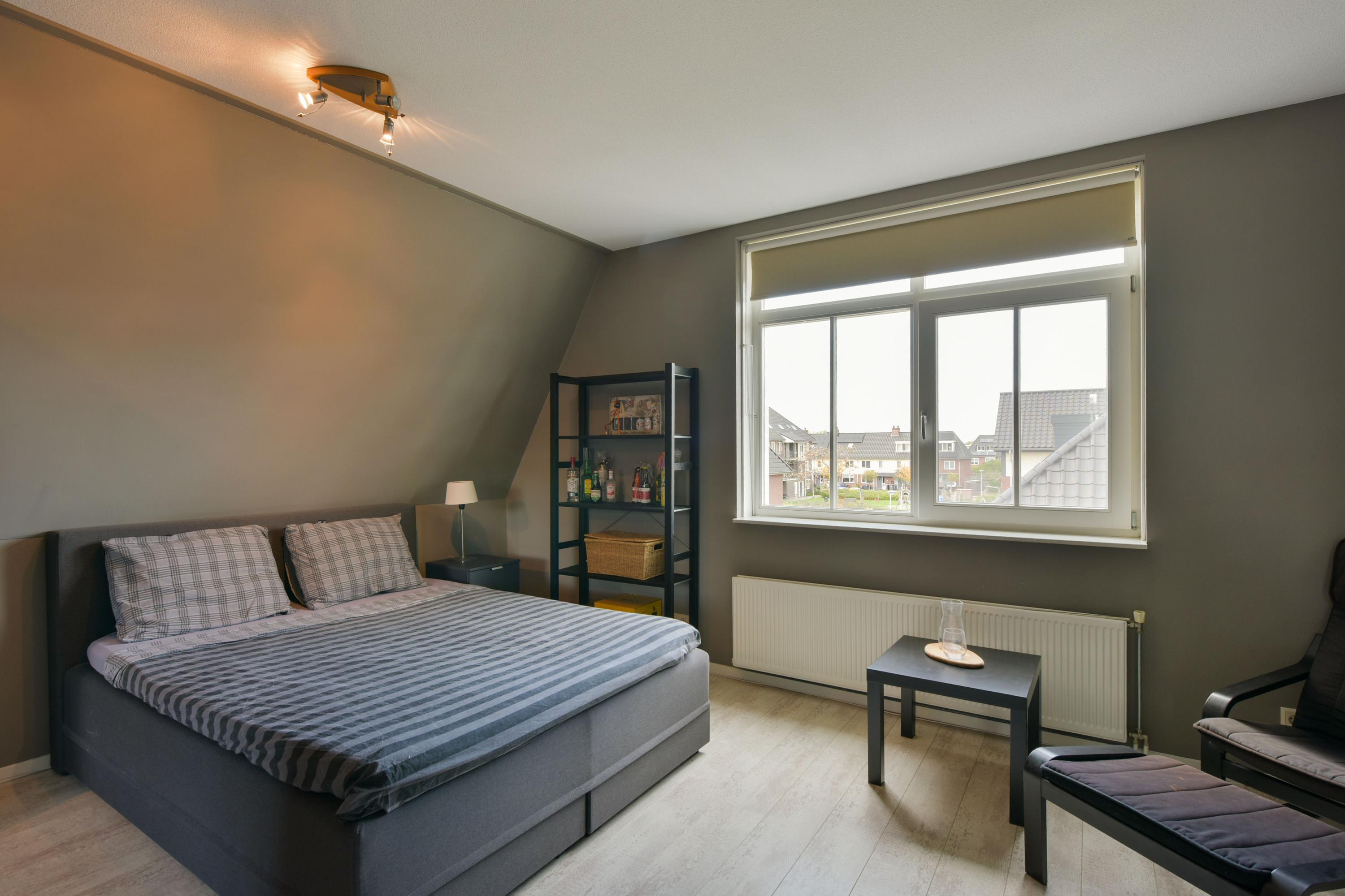 Op de eerste verdieping vindt u een ruime overloop die toegang biedt tot drie lichte en comfortabele slaapkamers. De hoofdslaapkamer voelt als een echte retreat, royaal en rustig, terwijl de zijslaapkamer met erkerraam en de derde slaapkamer aan de voorzijde flexibel zijn in gebruik – ideaal voor kinderen, logees of een thuiswerkplek. De badkamer is een plek van ontspanning: een douche met hand- en regendouche, een ligbad, dubbel wastafelmeubel en subtiele inbouwspotjes zorgen voor een luxe sfeer. Het separaat toilet maakt het geheel compleet.