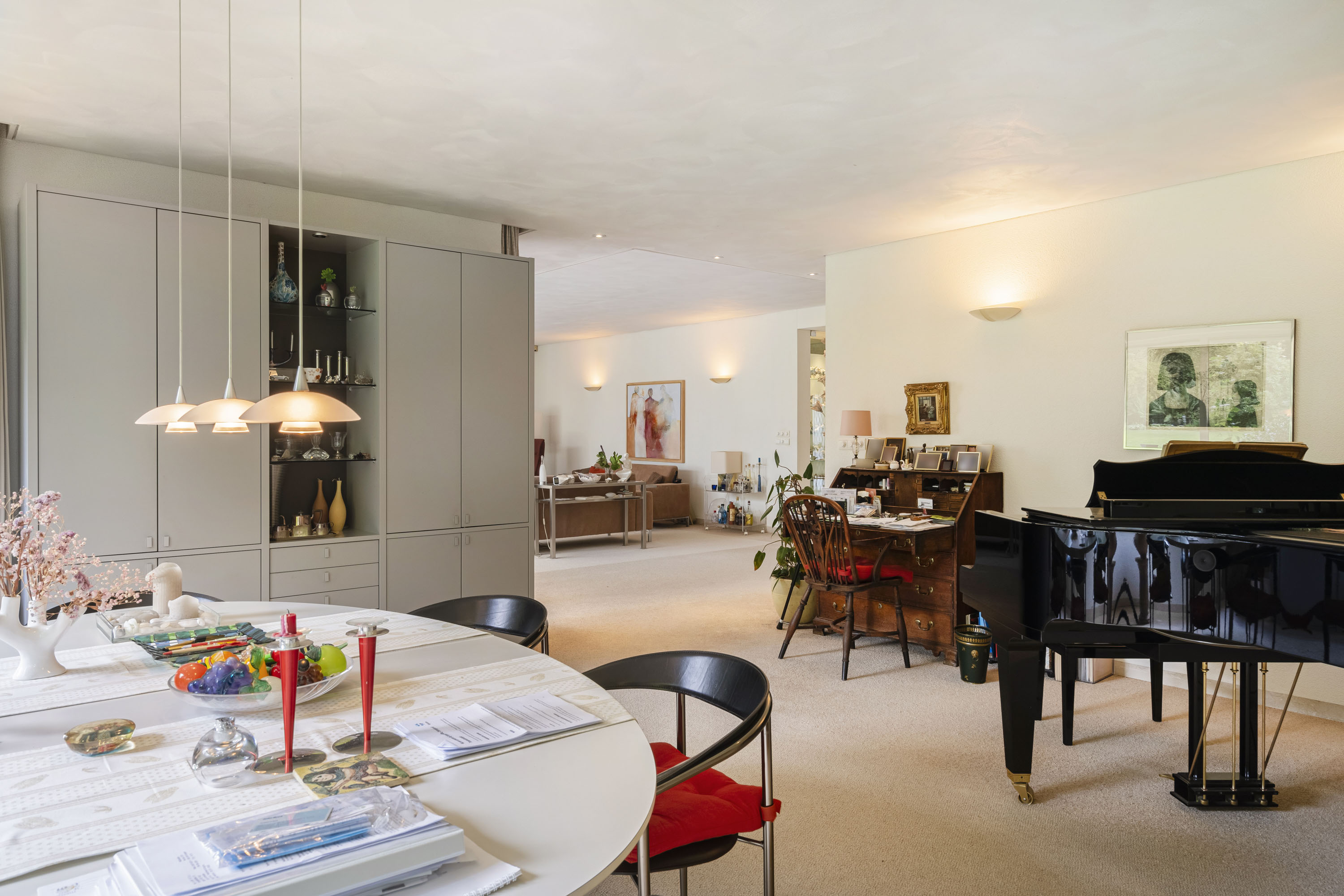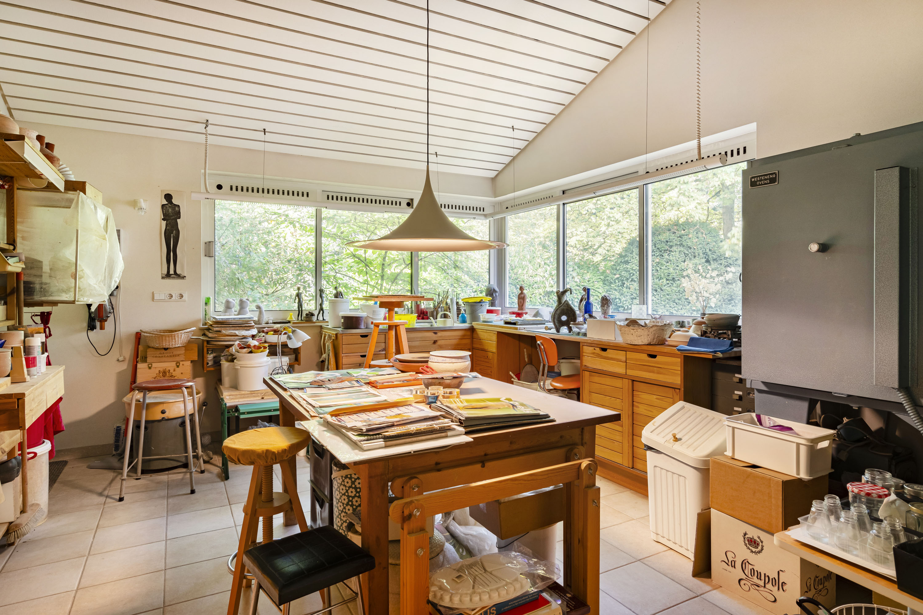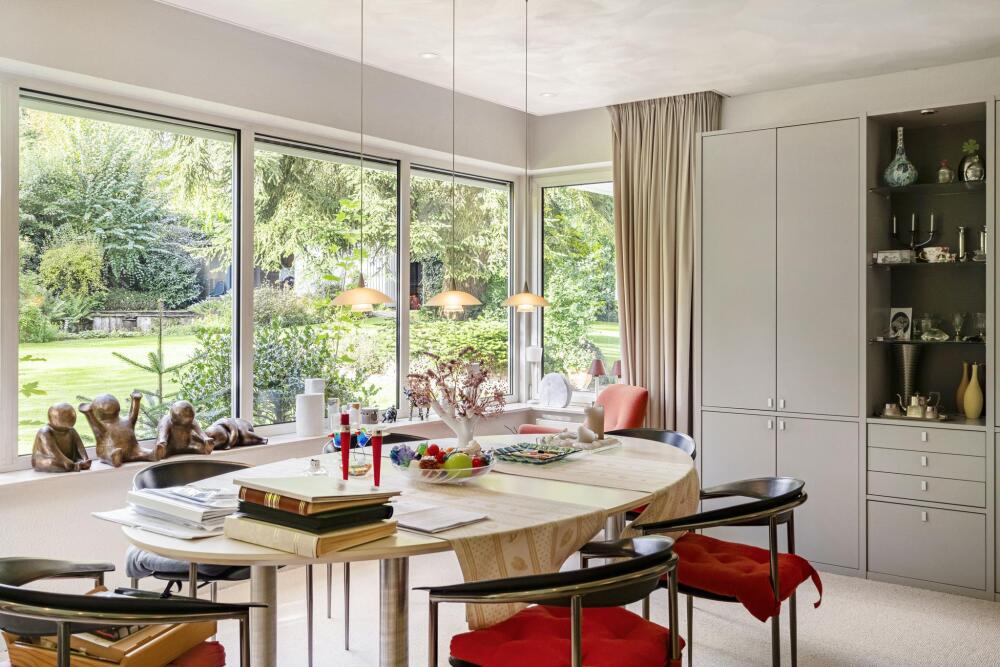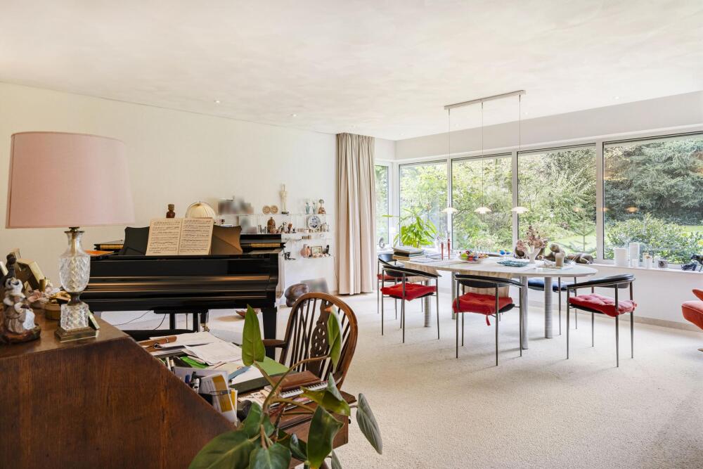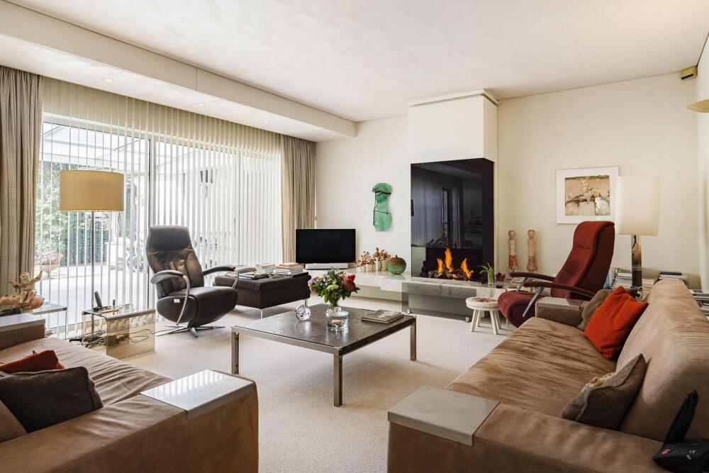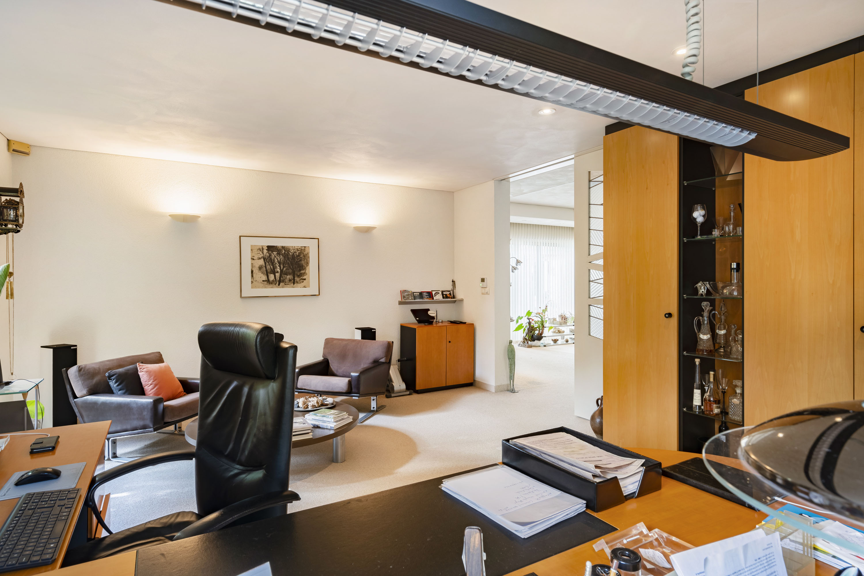 Als we verder gaan op de begane grond komen we in het zeer royale woongedeelte. De zitkamer beschikt over een glazen pui over de gehele breedte, waardoor er werkelijk een fantastisch uitzicht is over de tuin. Verder is er een leefkeuken met een aangrenzende bijkeuken voorzien van een goederenlift vanuit het souterrain. De eetkamer is gesitueerd aan de tuinzijde en daartussen bevindt zich een royale werkkamer. Al deze ruimten in het woongedeelte staan in open verbinding met elkaar. Werkkamer en keuken kunnen met fraaie schuifdeuren afgescheiden worden. Het royale overdekte buitenterras grenzend aan de zitkamer is voorzien van een elektrisch schuifdak inclusief zonwering en heeft haar toegang vanuit de zitkamer middels een schuifpui.