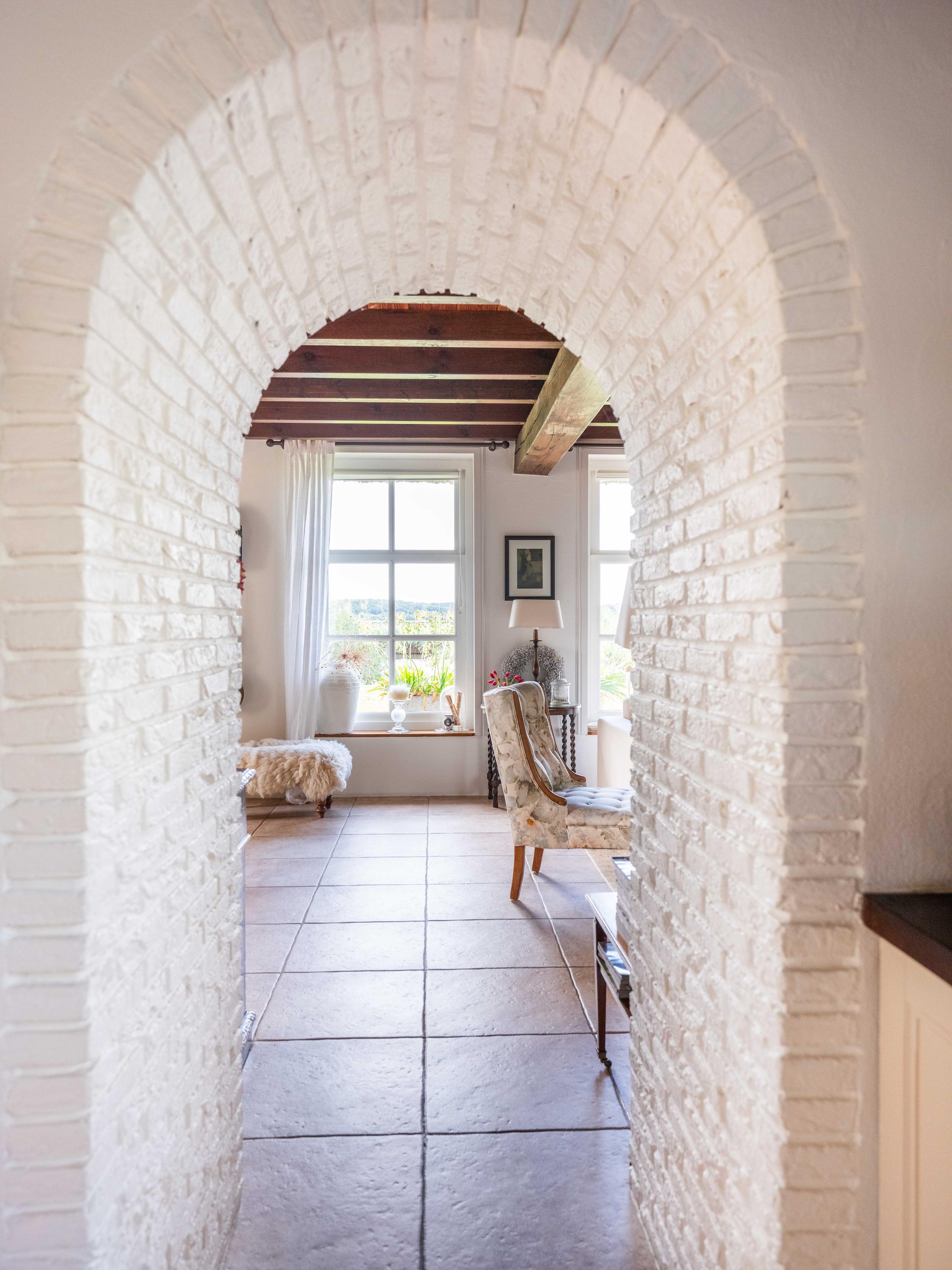 Via de hal met garderoberuimte en bergkast bereik je het toilet met fonteintje en de trap naar de eerste verdieping. Vanuit de hal stap je direct door naar de gezellige eetruimte met open keuken. De grote ramen bieden een prachtig zicht op de groene tuin rondom. De landelijke keuken is voorzien van vaste kasten en volop bergruimte. Vanuit hier is er tevens toegang tot de ruime kelder, ideaal voor voorraad of als wijnkelder. De royale woonkeuken vormt het hart van het huis, met authentieke details zoals een Engelse fornuis met vier ovens en karakteristieke balkenplafonds.