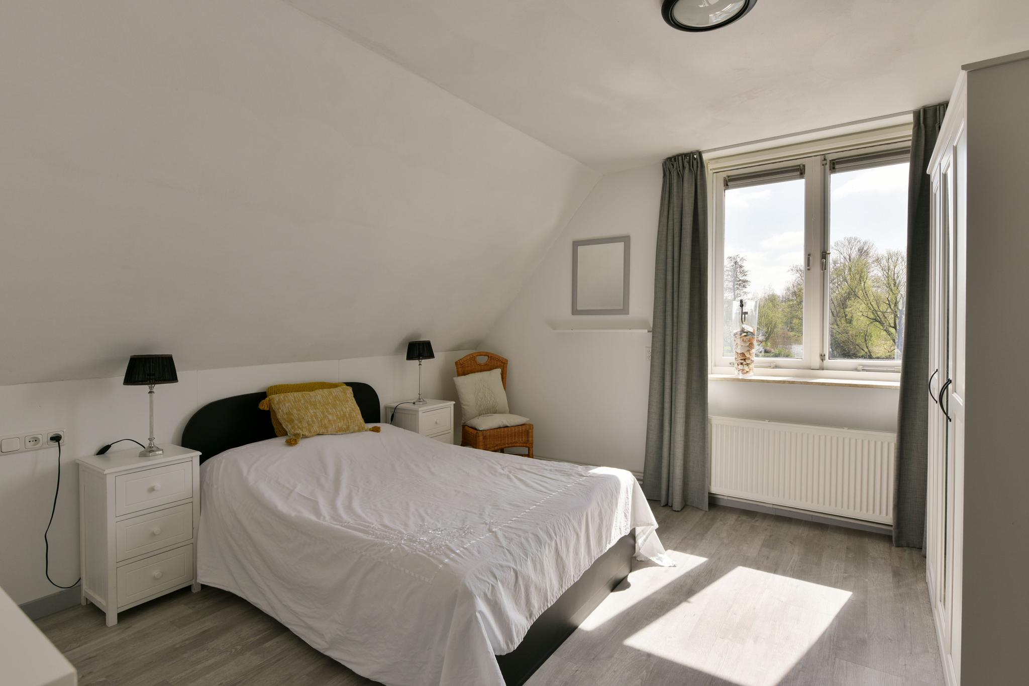 Via de trap in de woonkamer bereik je de bovenverdieping met nog twee royale slaapkamers en een badkamer. De slaapkamer aan de achterzijde heeft openslaande deuren naar een balkon met opnieuw dat magische uitzicht over water en landerijen. Hier wil je nooit meer weg. Ook deze woning beschikt over een praktische wasruimte met cv-ketel en de aansluitingen voor witgoed plus extra bergruimte. Ook deze woning beschikt over een bergvliering die met vlizotrap te bereiken is.