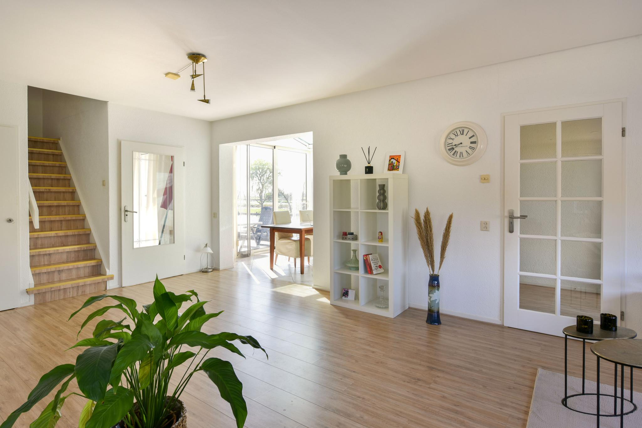 We beginnen de rondleiding bij de grootste woning. Al bij binnenkomst in de riante hal voel je het: dit is geen standaard huis. Hier wordt met liefde en aandacht geleefd. De hal is opvallend licht dankzij een groot dakraam boven het trappenhuis en biedt toegang tot een garderobe, trapkast, toilet én de sfeervolle woonkamer. De woonkamer is het kloppend hart van de woning, hier wordt je aandacht direct getrokken door het water aan de achterzijde van de woning, de grote glazen pui zorgt voor een uniek plaatje. De woonkamer is een lichte, uitnodigende ruimte waar comfort en sfeer samenkomen. Dankzij de grote raampartijen stroomt het daglicht rijkelijk naar binnen en kijk je overal uit op het kalmerende water. De plavuizen vloer met vloerverwarming zorgt het hele jaar door voor een behaaglijk gevoel. Voor extra warmte op koude dagen zijn er bovendien een convectorput en enkele radiatoren aanwezig. Aan de voorzijde vind je via stijlvolle glazen klapdeuren een multifunctionele ruimte die nu ingericht is als kantoor, maar ook perfect als slaapkamer kan dienen dankzij de aangrenzende badkamer met douche en wastafel. Een extra plus voor wie levensloopbestendig wil wonen of gasten in stijl wil ontvangen. De open keuken, met een uitzicht alsof het uit een schilderij komt, is van alle gemakken voorzien. Een koelkast, vriezer, koel-la, vaatwasser, combi-magnetronoven, inductiekookplaat én een Quooker maken dit een heerlijke plek om te koken, borrelen en leven.