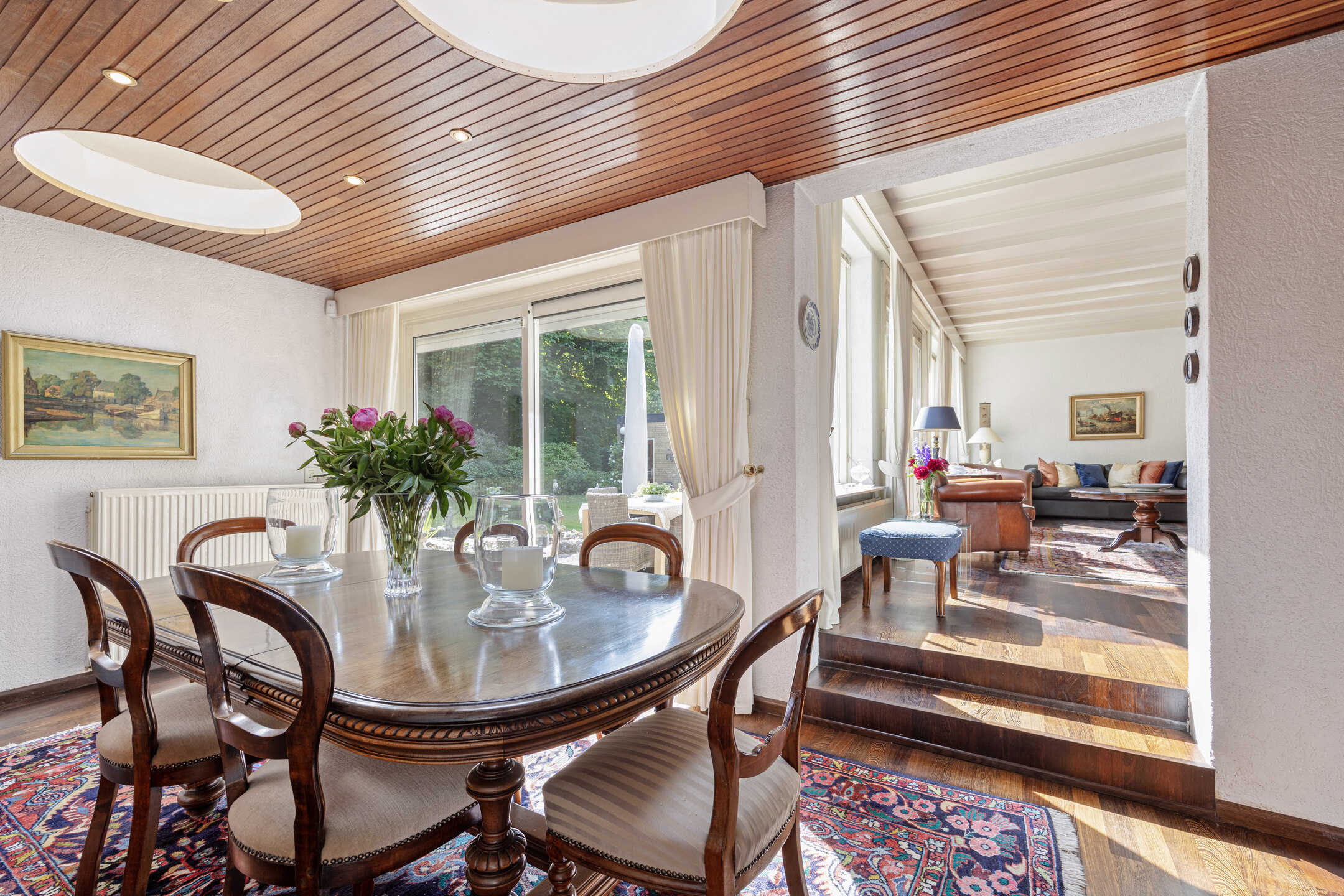 Внутри на первом этаже расположена уютная гостиная с камином, большая столовая и открытая кухня, оснащённая газовой плитой, вытяжкой, холодильником с морозильной камерой и посудомоечной машиной. Кладовая и универсальный кабинет у фасада предоставляют гибкость для работы из дома или отдыха. Пять спален, включая апартаменты на первом этаже с видом на сад, а также две продуманных в деталях ванные комнаты обеспечивают комфорт семье или гостям. Электрические рольставни, утеплённая крыша, двухкамерные стеклопакеты и система сигнализации подчёркивают безопасность и позволяют контролировать освещение.