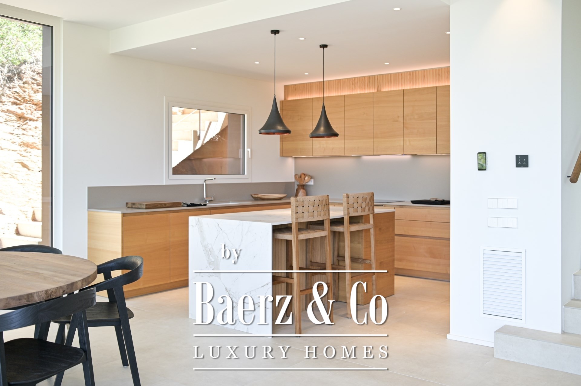 Площадь виллы составляет 347 м² на участке 925 м²; здесь четыре спальни и три ванные комнаты. Стеклянные стены интерьеров растворяют границы и наполняют дом средиземноморским светом. Элитные материалы и индивидуально выполненные отделки придают пространству спокойный, размеренный характер, а террасы, бассейн, навес для машины и ландшафтный сад обеспечивают возможность наслаждаться открытым пространством в полной приватности. Безопасность гарантирована системой сигнализации и закрытым входом; кондиционирование и отопление обеспечивают комфорт в любое время года.