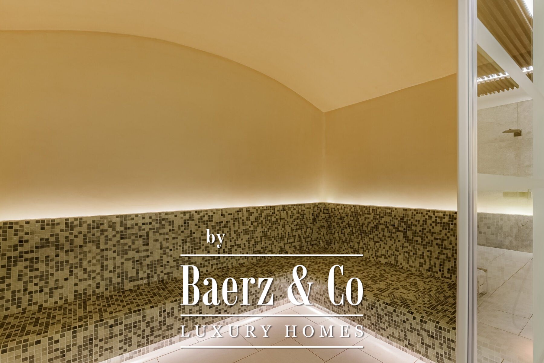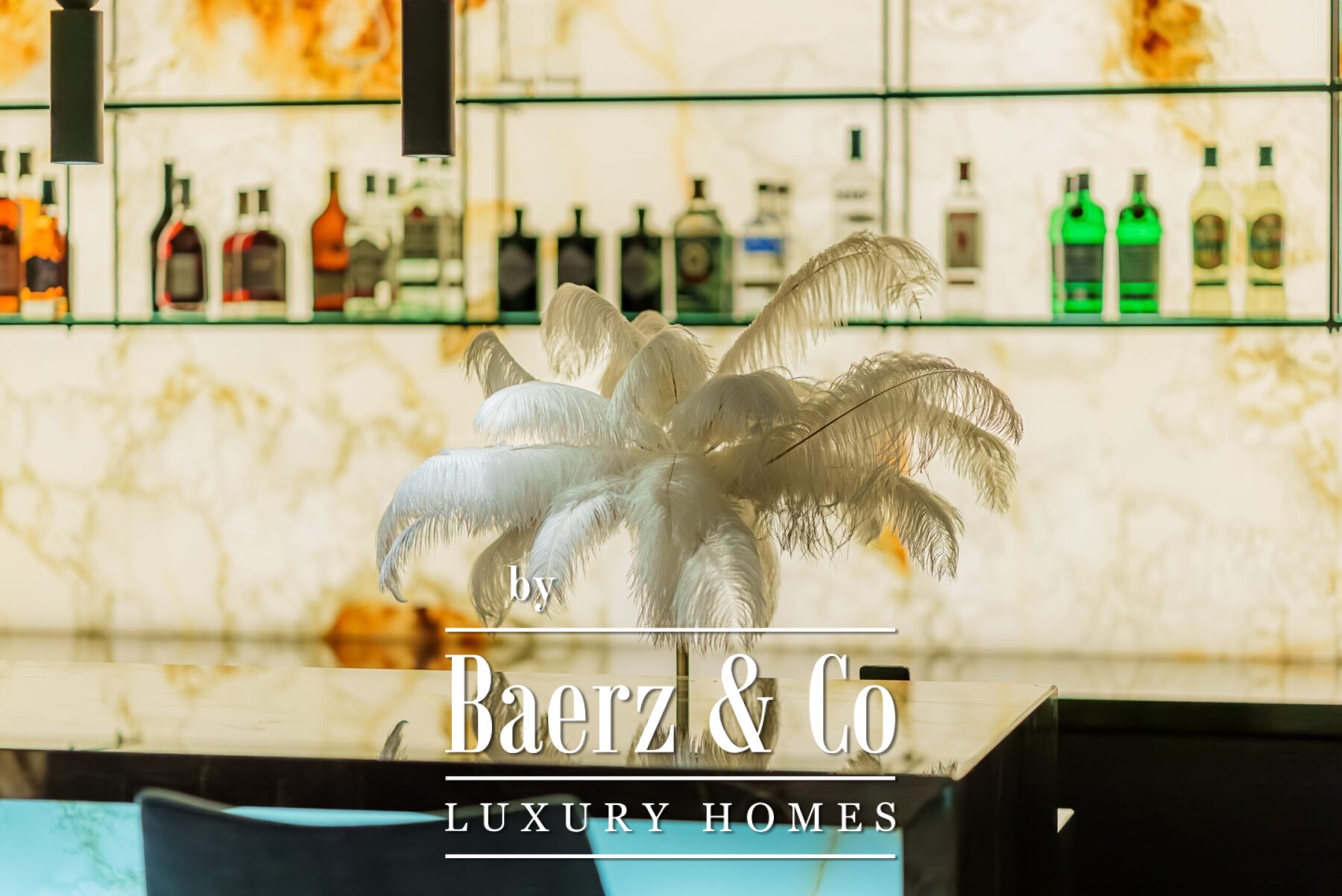 Главная гостиная впечатляет высокими потолками и стеклянными дверями во всю высоту, которые полностью убираются в стены, наполняя помещение естественным светом и объединяя интерьер с просторными террасами, благоустроенным садом и бассейном с эффектом бесконечности. Открытая планировка создана для уединённых и ярких встреч в атмосфере эстетики и утончённого ритма современной жизни.