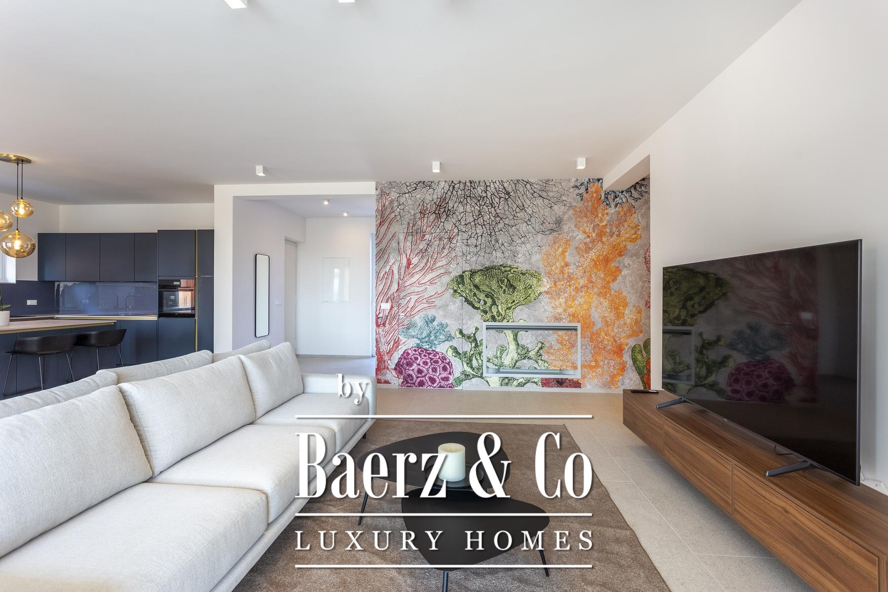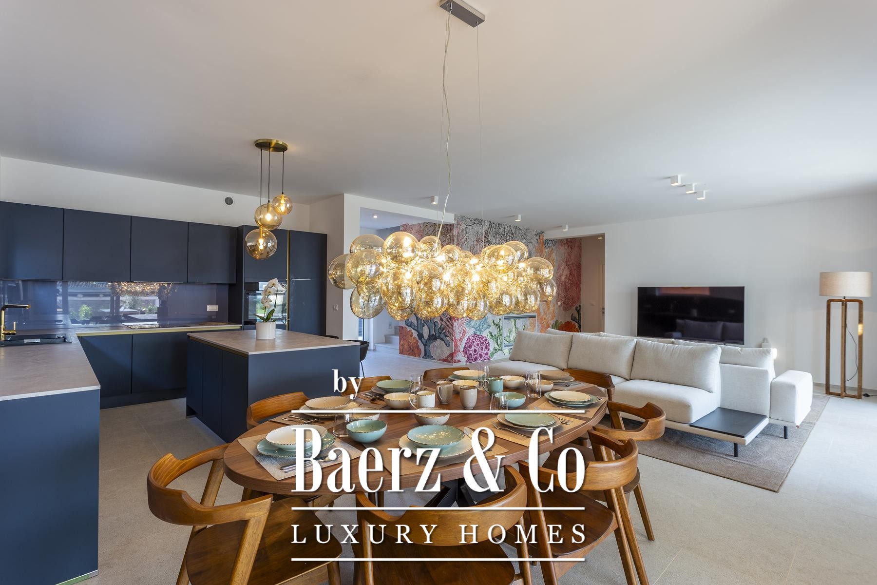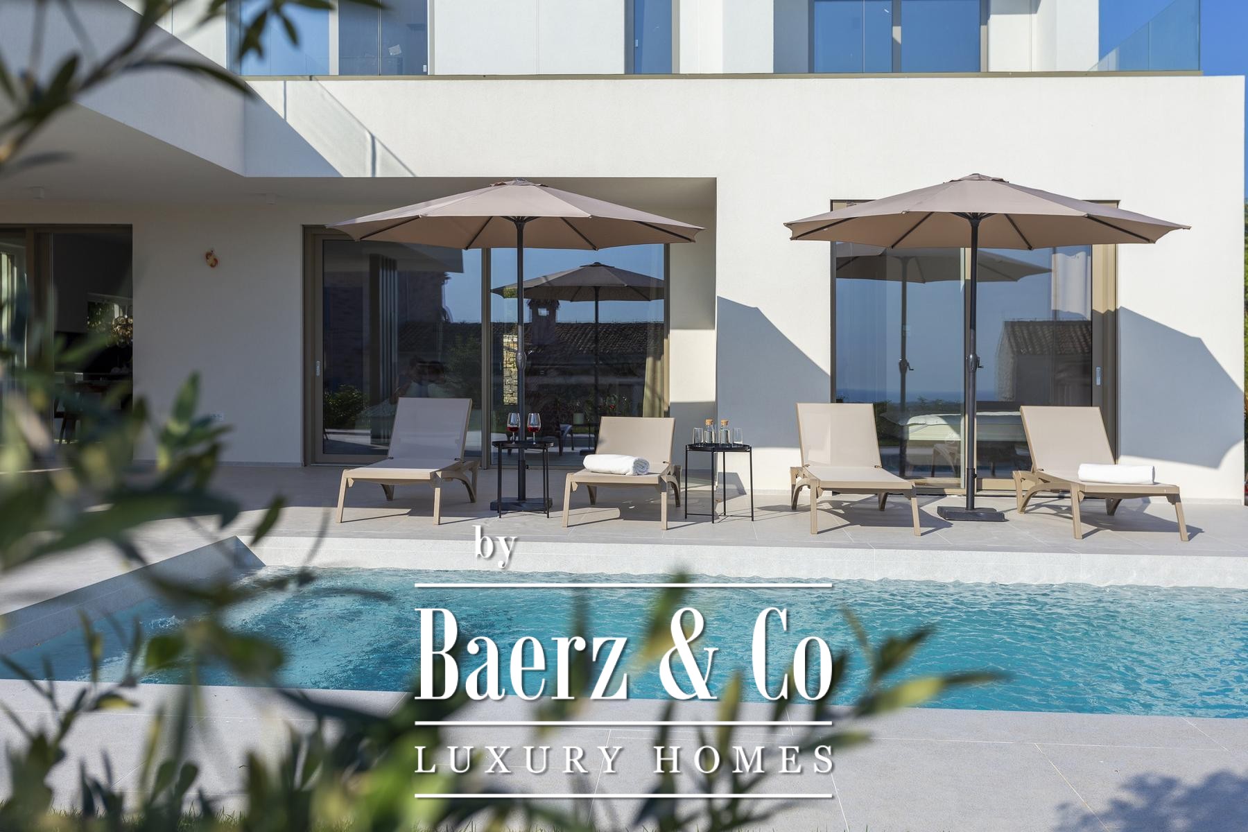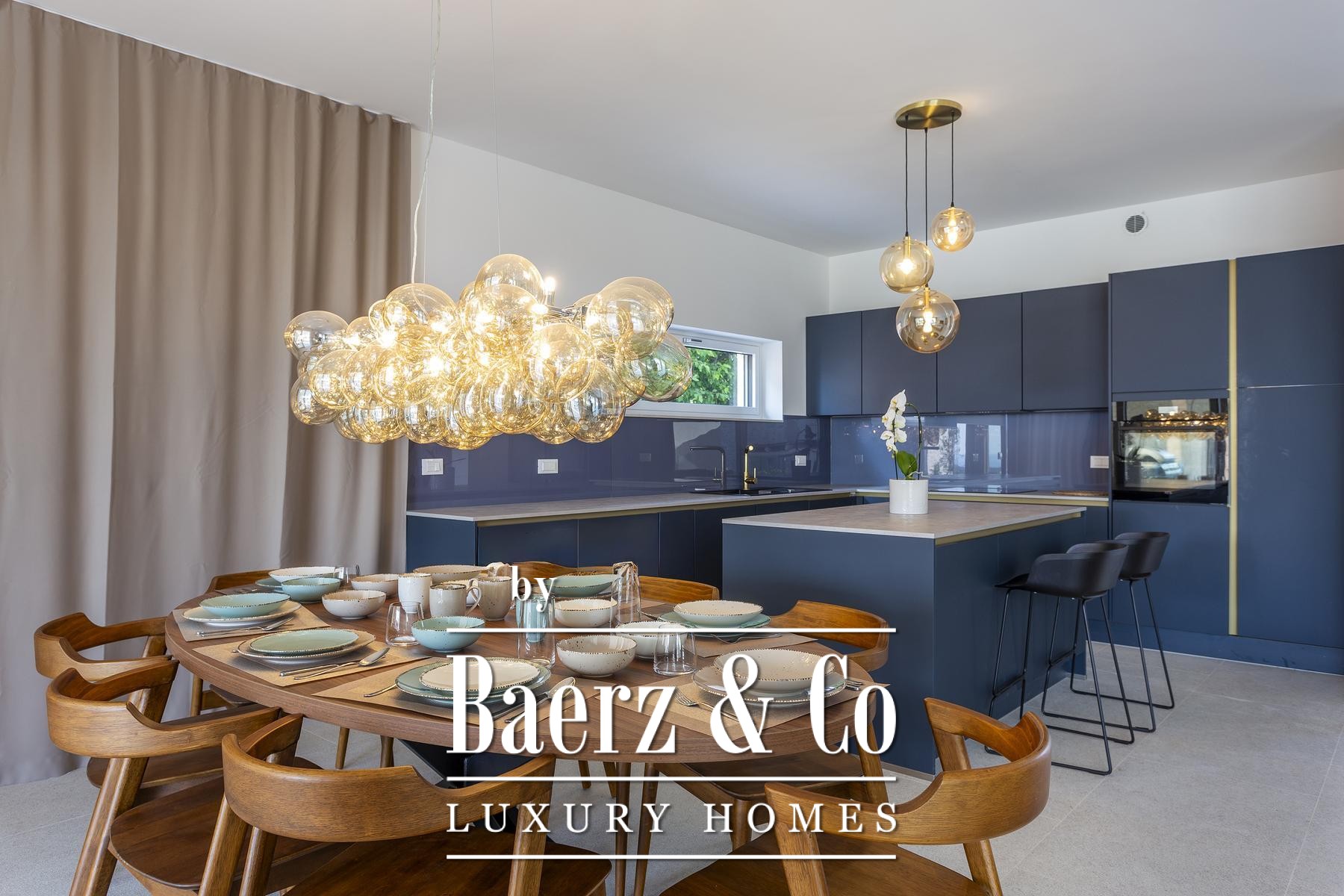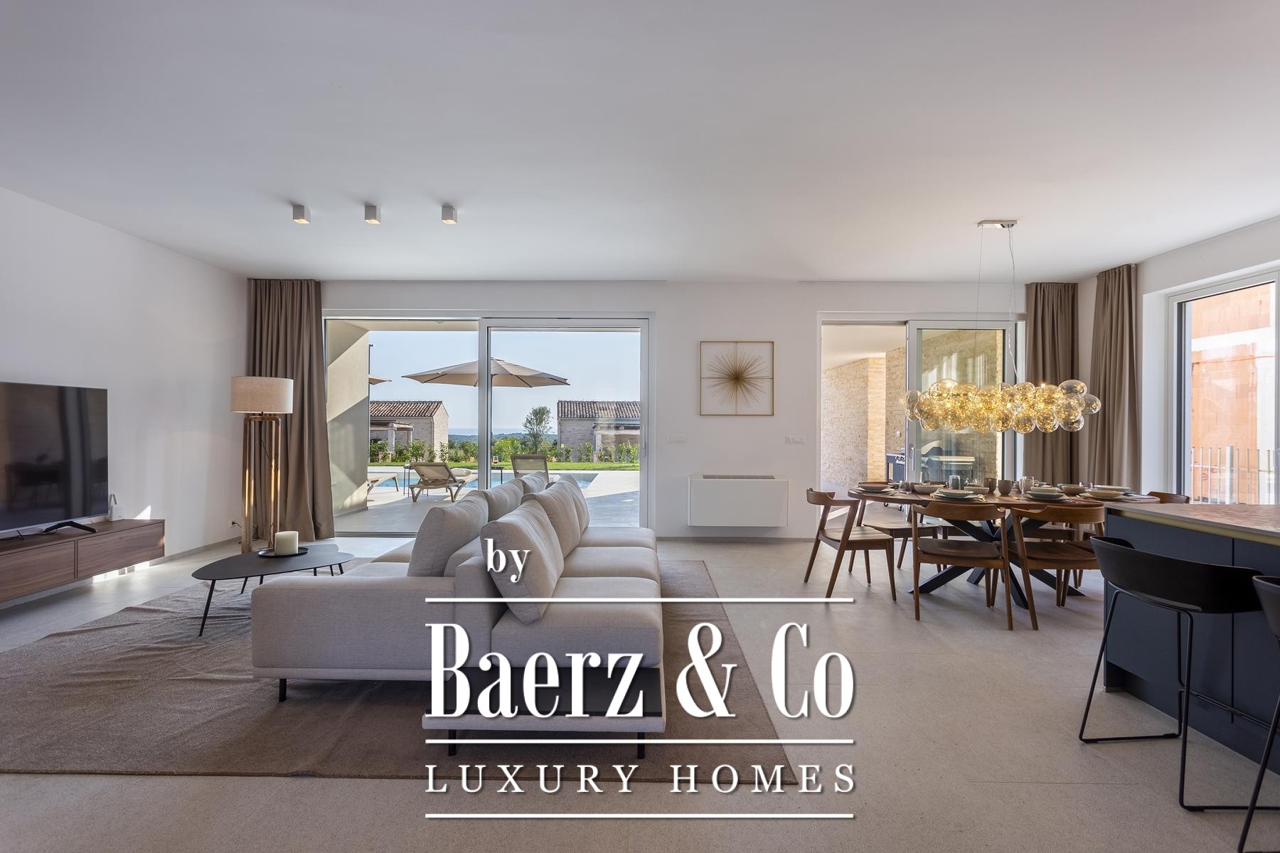 开放式起居空间集合了餐厅与配备全球知名品牌高端家电的全套厨房。客厅的设计师家具为别墅量身定制,兼具舒适性与海景视野。落地玻璃窗让自然光大量涌入,无缝衔接至宽敞的有顶露台——这里是招待宾客的绝佳场所,环抱在精心修剪的花园、30平方米泳池和更辽阔海景之中。户外烧烤设备更延伸了户外生活的乐趣。