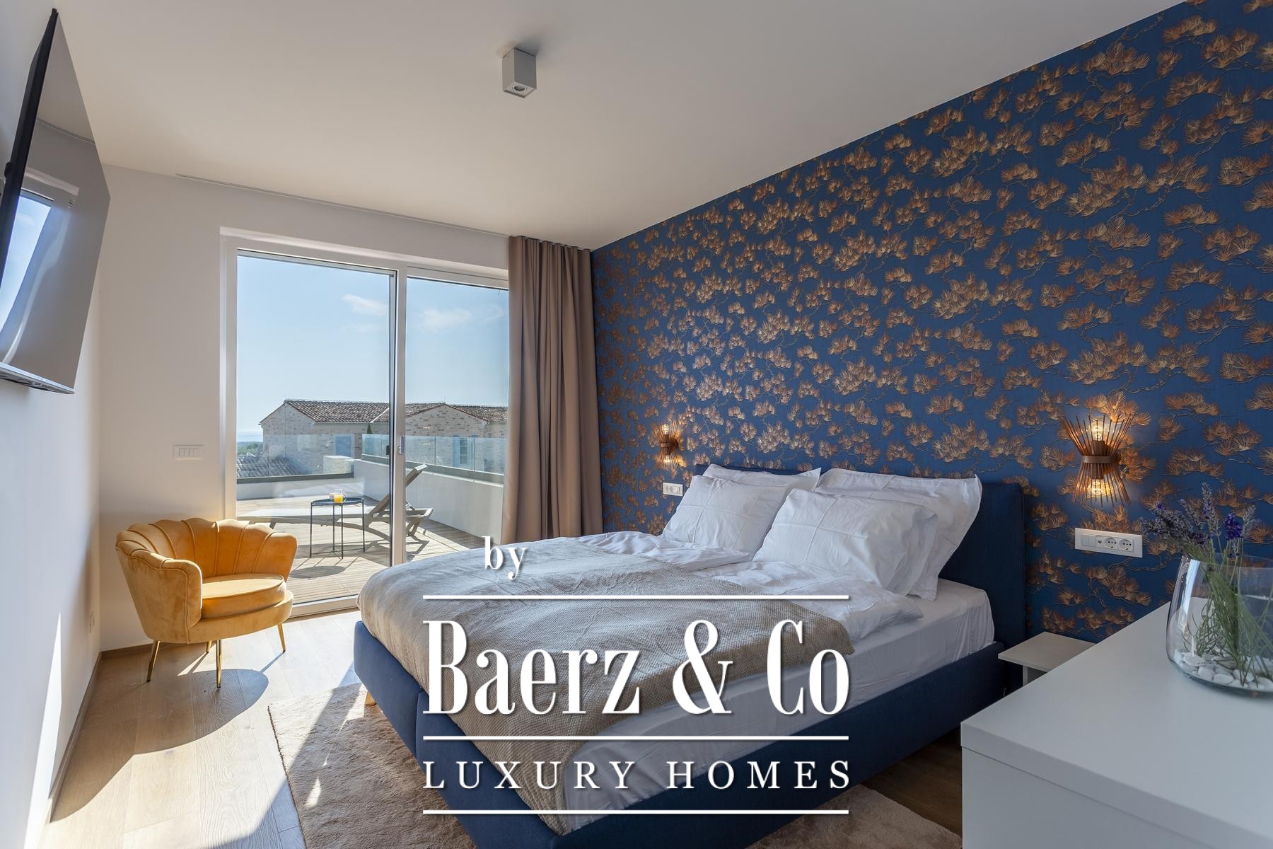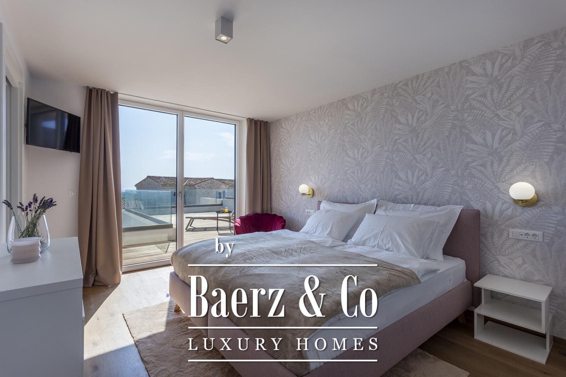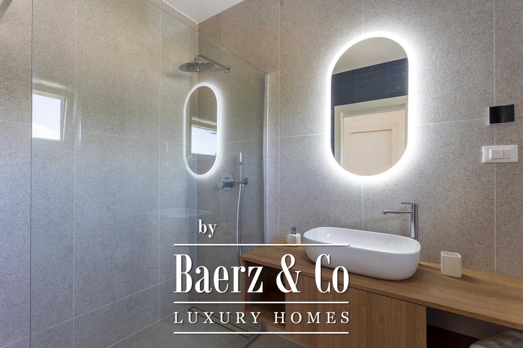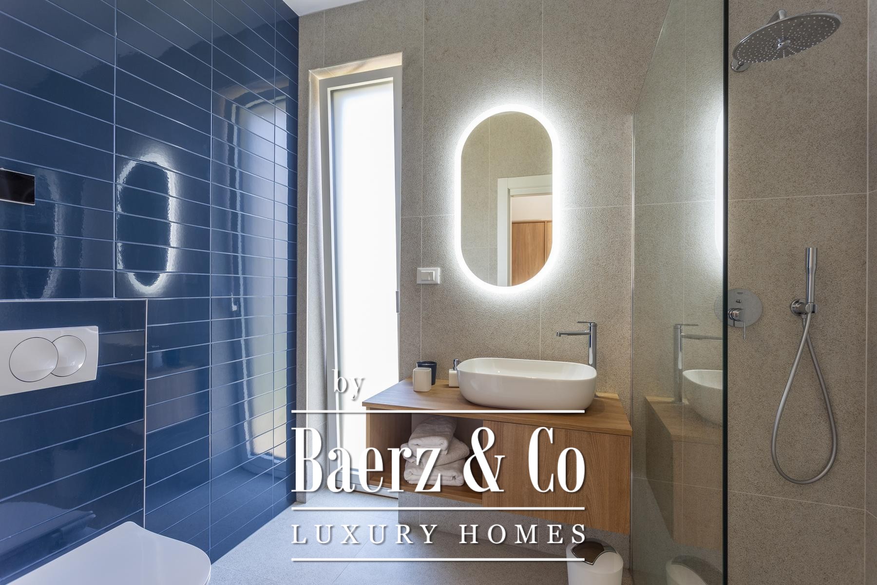 底层的私人区域包括带套间浴室的卧室、技术间和储藏室。拾级而上,二楼设有三间额外卧室,均为套间,并可通往宽大的露台,俯瞰亚得里亚海,由此为未来安装按摩浴缸预留了空间。全屋采用地暖、优质实木地板与高等陶瓷,结合每一处空间独立空调系统,提升整体生活品质。