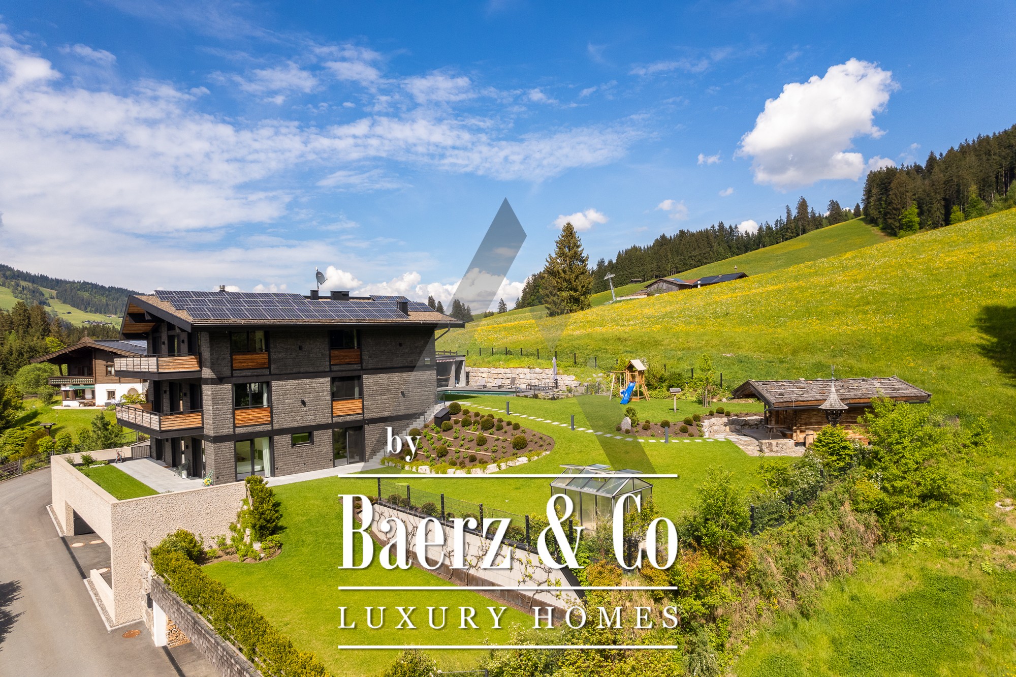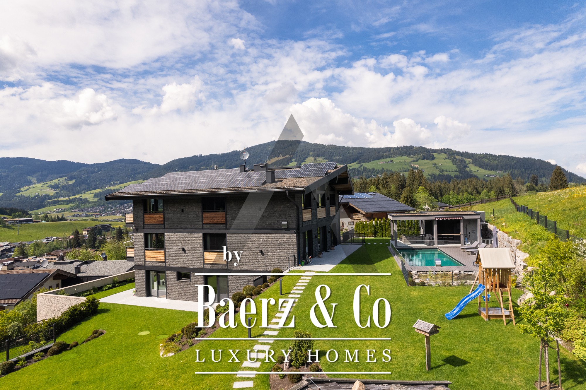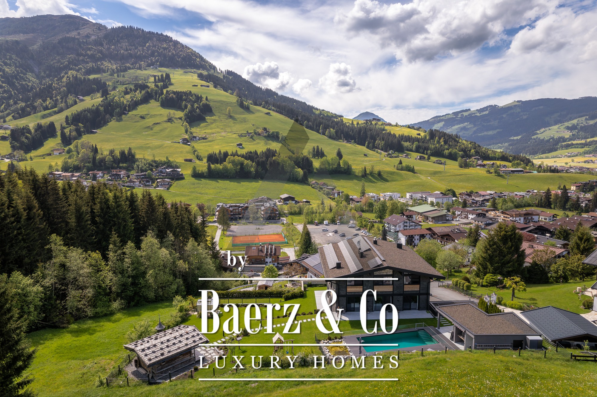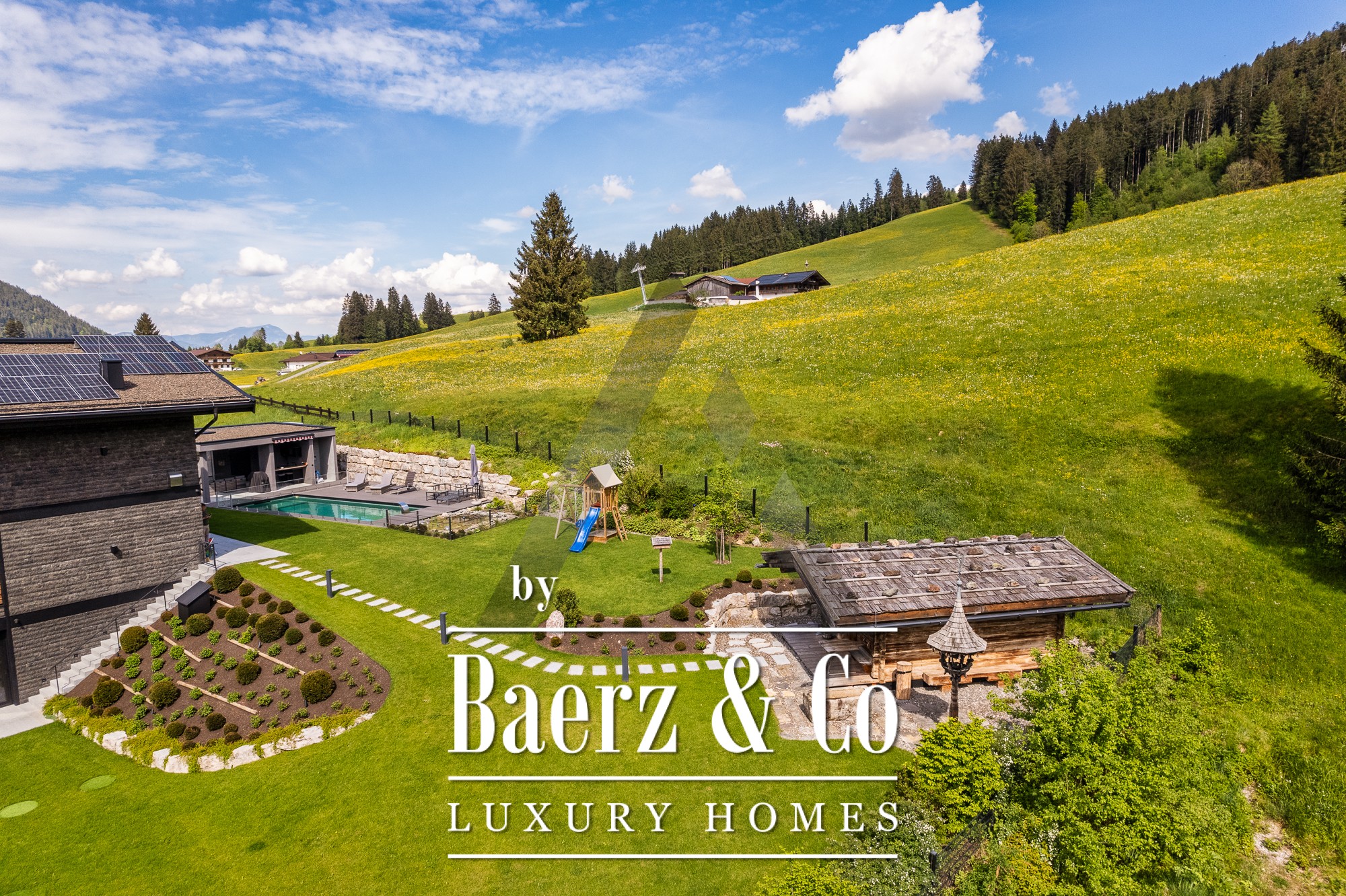 This unique home is in a very sunny and quiet location on the outskirts of Kirchberg, on an approx. 1,971m² lot. The property borders on meadows and forests to the south and east, and there are only two neighbors below in the north and west. The view extends from Gaisberg over the Hohe Salve and Kirchberg to the Kitzbüheler Horn.