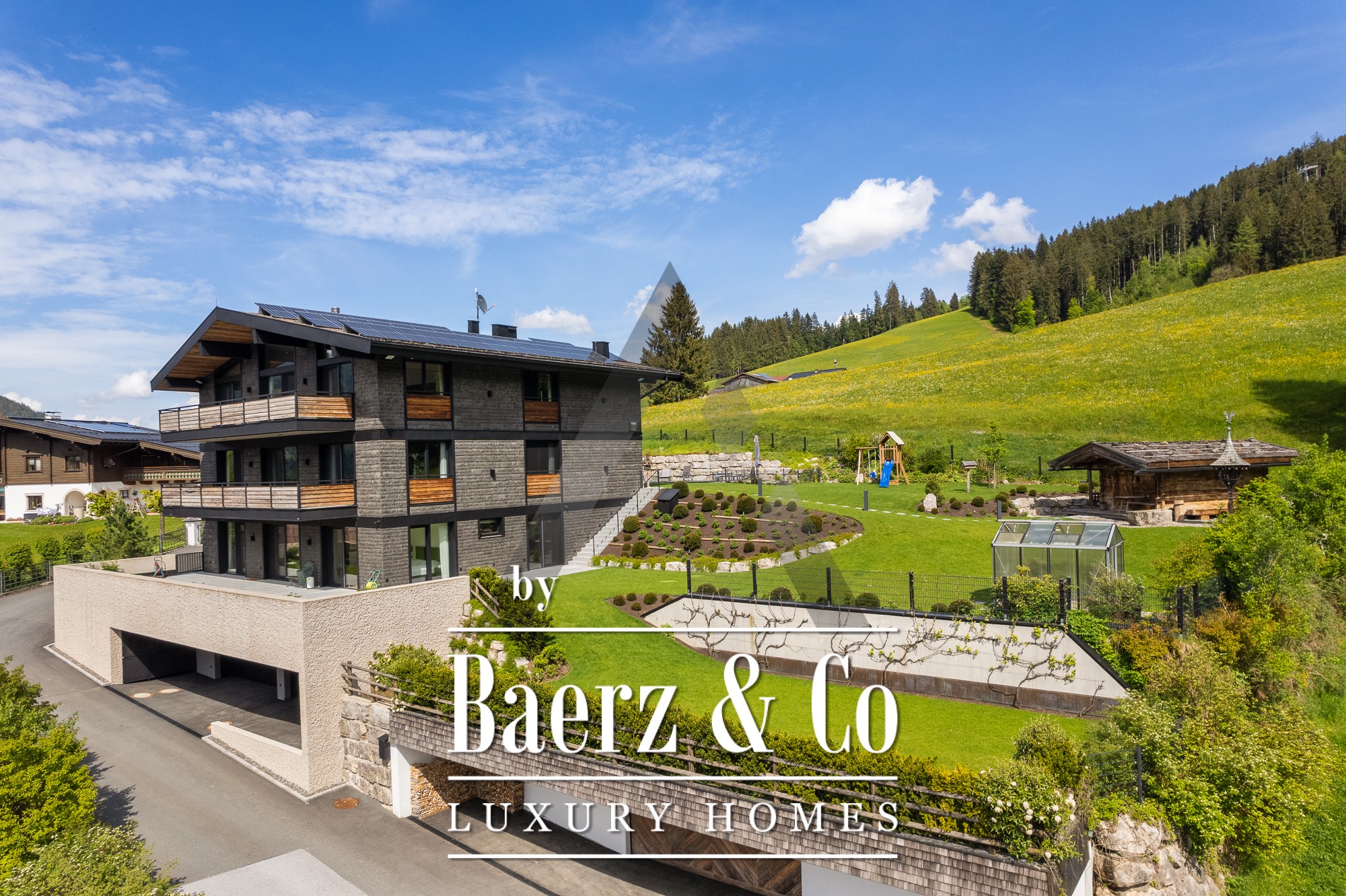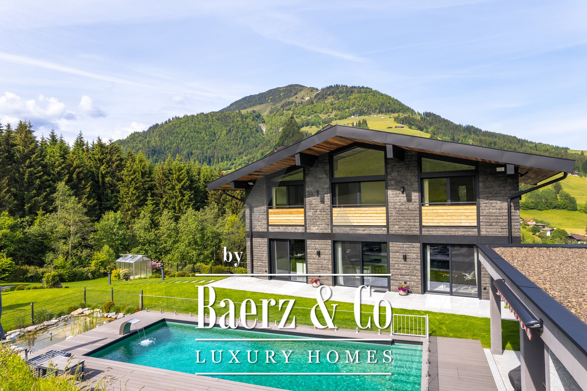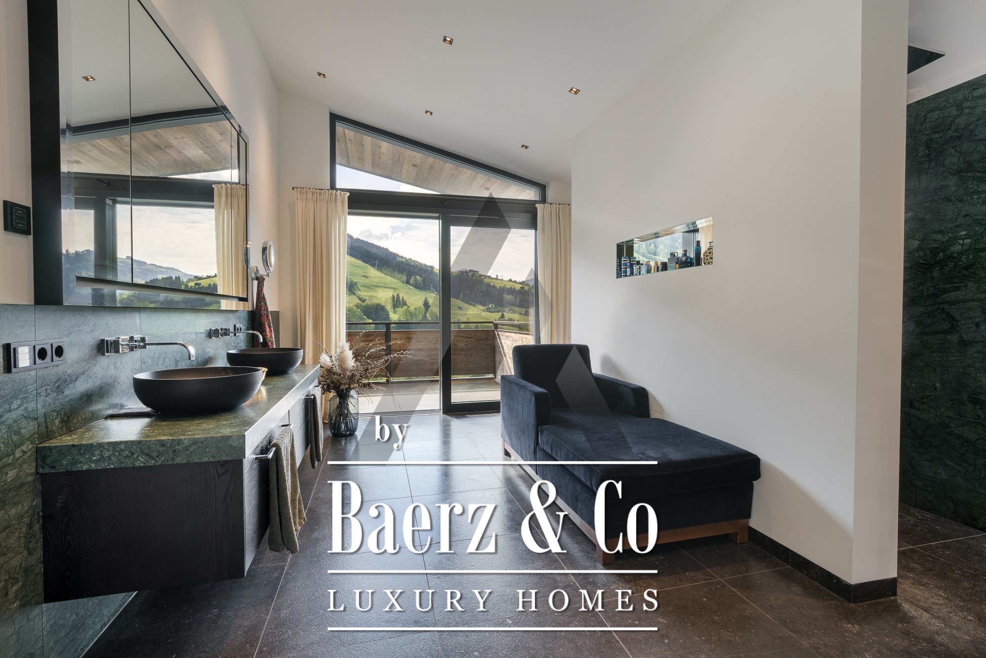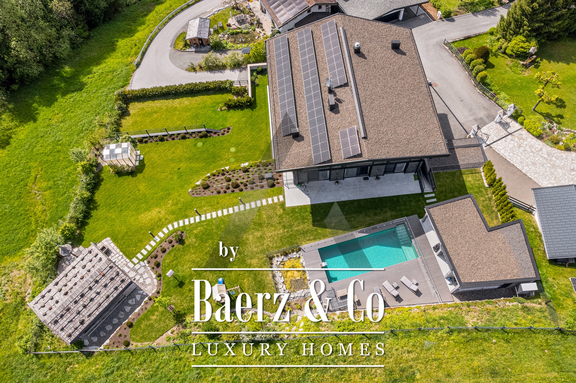 This unique home is in a very sunny and quiet location on the outskirts of Kirchberg, on an approx. 1,971m² lot. The property borders on meadows and forests to the south and east, and there are only two neighbors below in the north and west. The view extends from Gaisberg over the Hohe Salve and Kirchberg to the Kitzbüheler Horn.