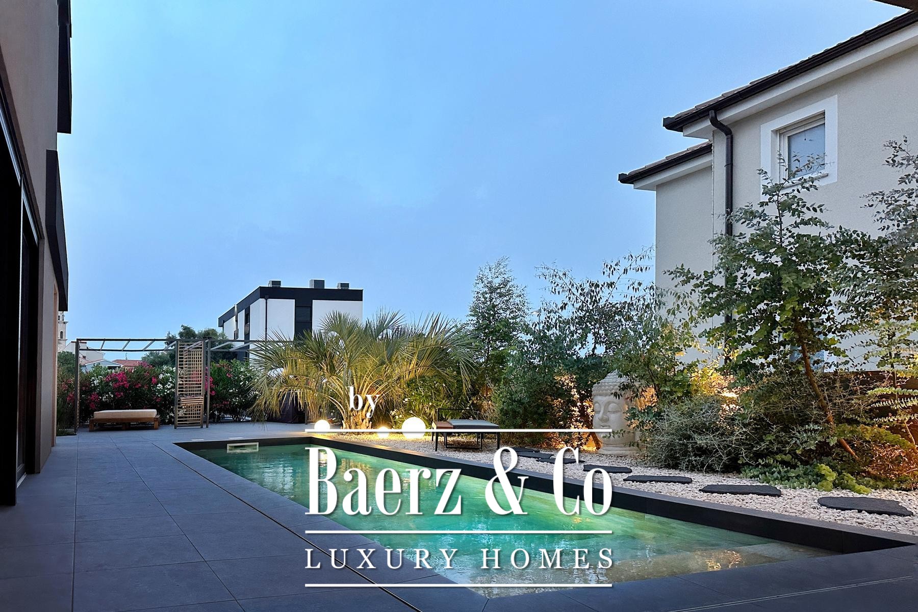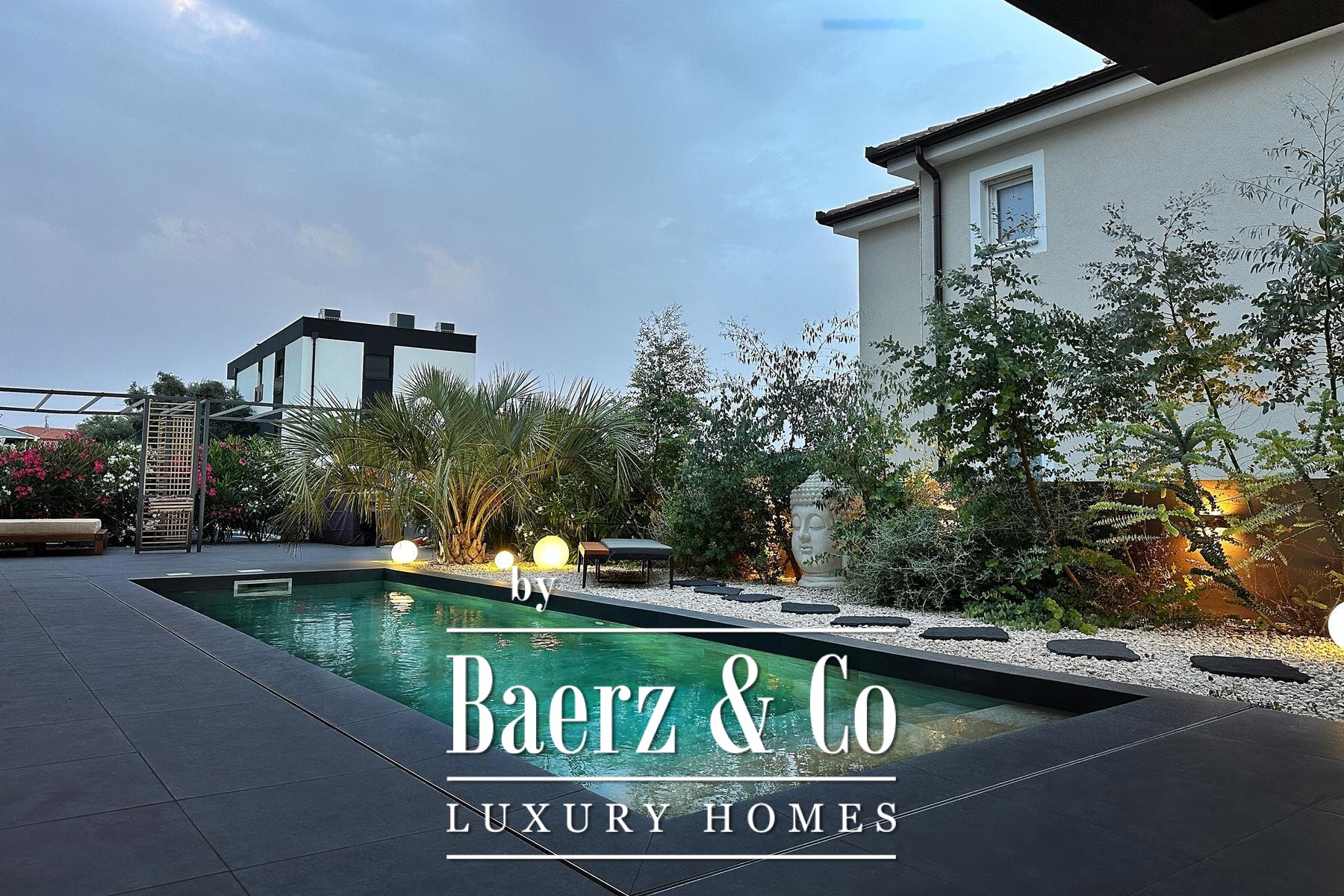 In Premantura, in the very south of the Istrian peninsula, this beautiful unique villa is located on a landscaped garden of 710 m2.It extends over two floors. The ground floor of the villa is dominated by a large, meticulously designed living room. Warm colors, unique pieces of furniture, lighting, a fireplace in the central part of the space, large glass walls with a view and access to the pool provide a feeling of warmth and home. On the ground floor there is also a comfortable kitchen, a bedroom, a toilet, a storage room, a technical room, and an exit to the large back yard.An elegant internal staircase leads to the first floor where there are two bedrooms. The large bedroom is a true combination of elegance and comfort, light and airy with a large covered terrace and a view of nature. The large bathroom is merged with the interior of the room and represents a true green oasis. The second bedroom of modern design also has its own bathroom.All the furniture and equipment of the villa is mainly from Germany, Italy and the Czech Republic.The entire villa has underfloor heating - a heat pump system, while each room has its own air conditioner.In the courtyard area there is a large barbecue, a comfortable terrace for socializing and resting. Green vegetation provides privacy, while modern lighting in the evening gives a magical touch to the villa itself. The villa has video surveillance.The entrance courtyard offers the possibility of parking for four vehicles.This unique villa in Premantura is a rarity on the market, so feel free to contact us for more information.