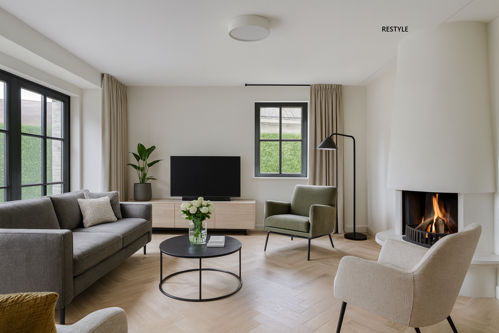 一层是明亮的客厅,设有观景凸窗并以燃气壁炉为中心。毗邻的U型厨房配备嵌入式电器,顺畅连接至餐区,方便聚会。杂物间用于储物并可通往户外,另有一间办公室及附近卫生间,适合一层式生活或接待宾客。地暖和双层玻璃窗确保四季温润宜居。